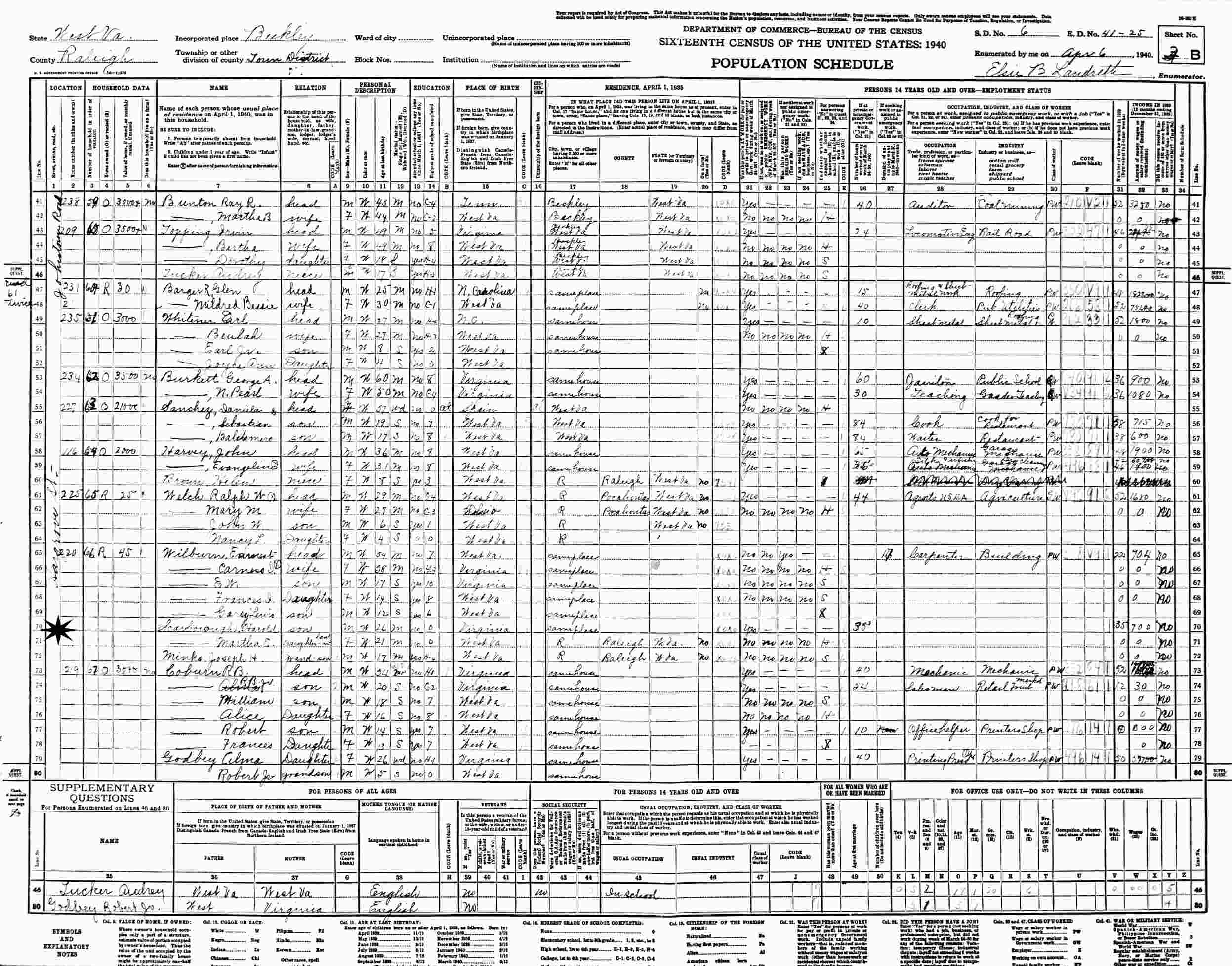 April 6, 1940 - 20 Hargrove Street, Supervisor's District 6, Enumeration District 41-25, Town District, Berkley, Raleigh County, West Virginia (w/stepfather and mother).