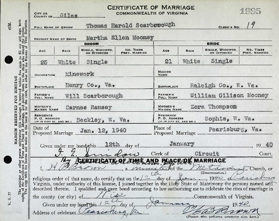 Married: Martha Ellen Mooney January 12, 1940 in Pearisburg, Virginia.