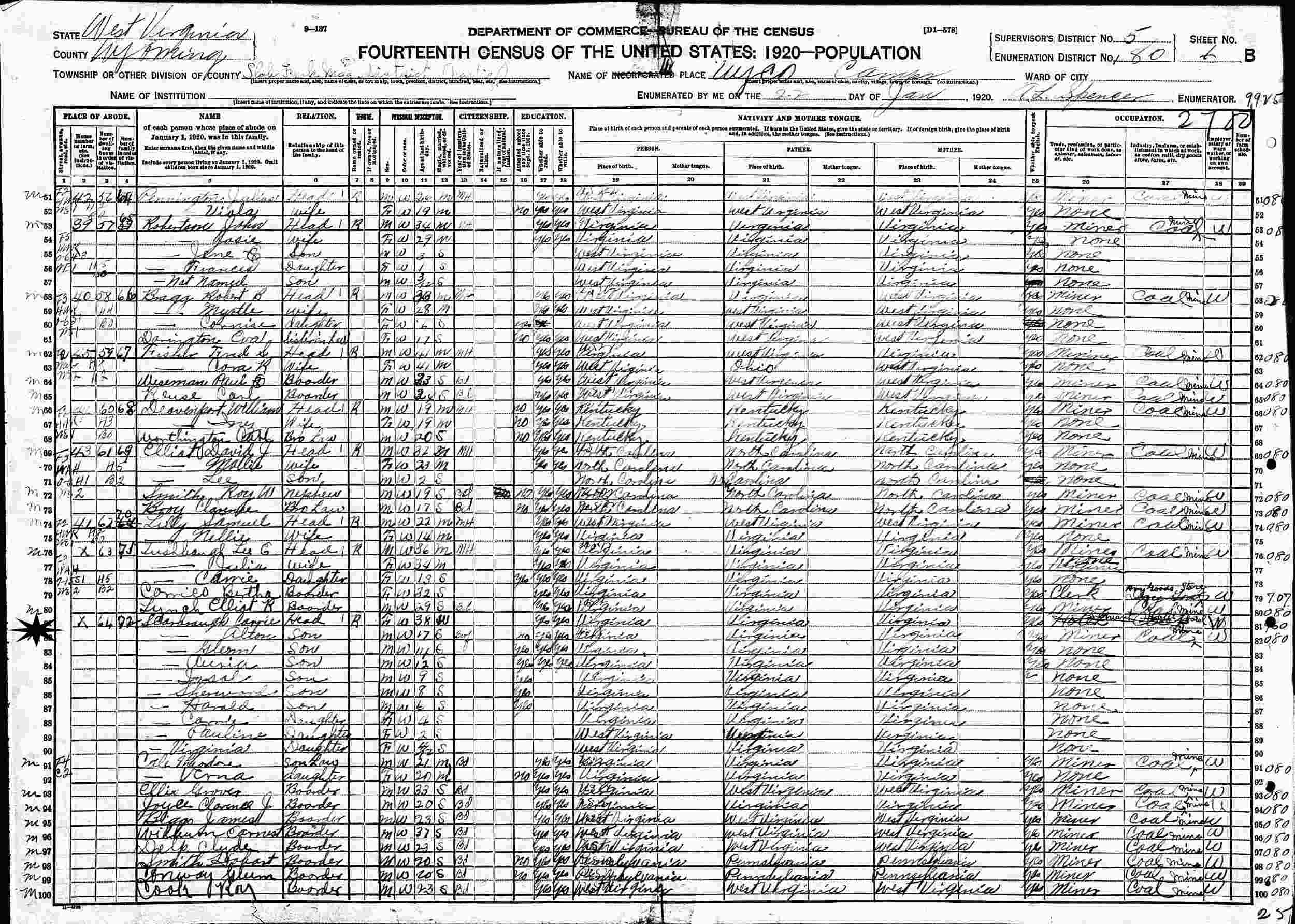 January 22, 1920 - Supervisor's District 5, Enumeration District 180, Slab Fork Magisterial District, Wyoming County, West Virginia.