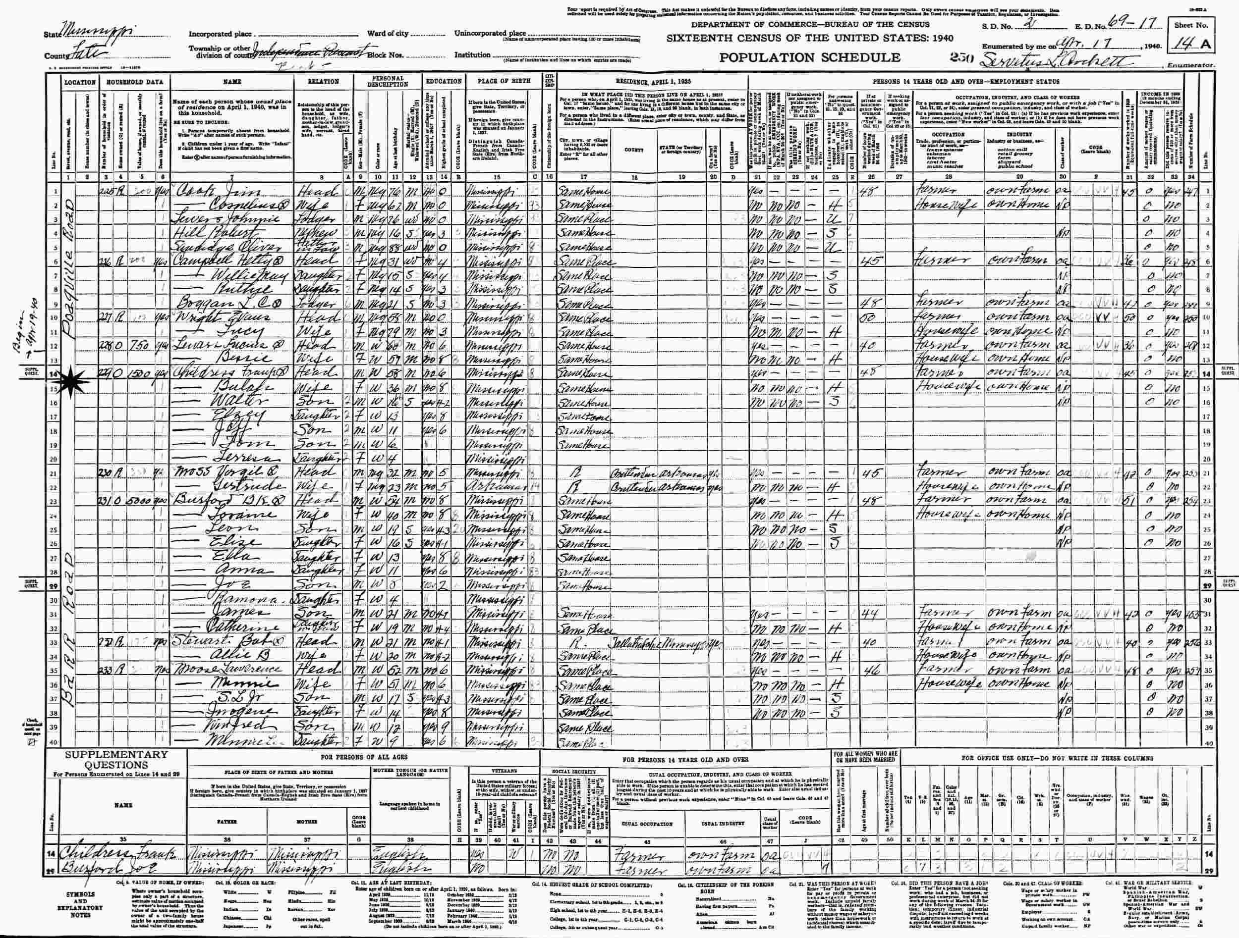 April 17, 1940 - Barr Road, Independence Precinct (crossed out to Precinct 5), Superivsor's District 2, Enumeration District 69-17, Tate County, Mississippi.