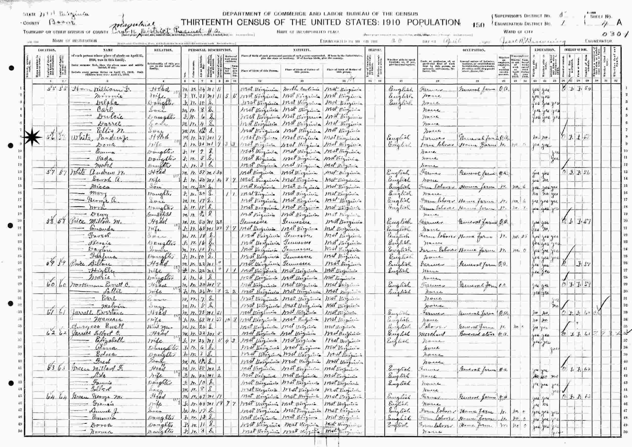April 20, 1910 - Precinct 2, Supervisor's District 6, Enumeration District 1, Crook Magisterial District, Boone County, West Virginia.