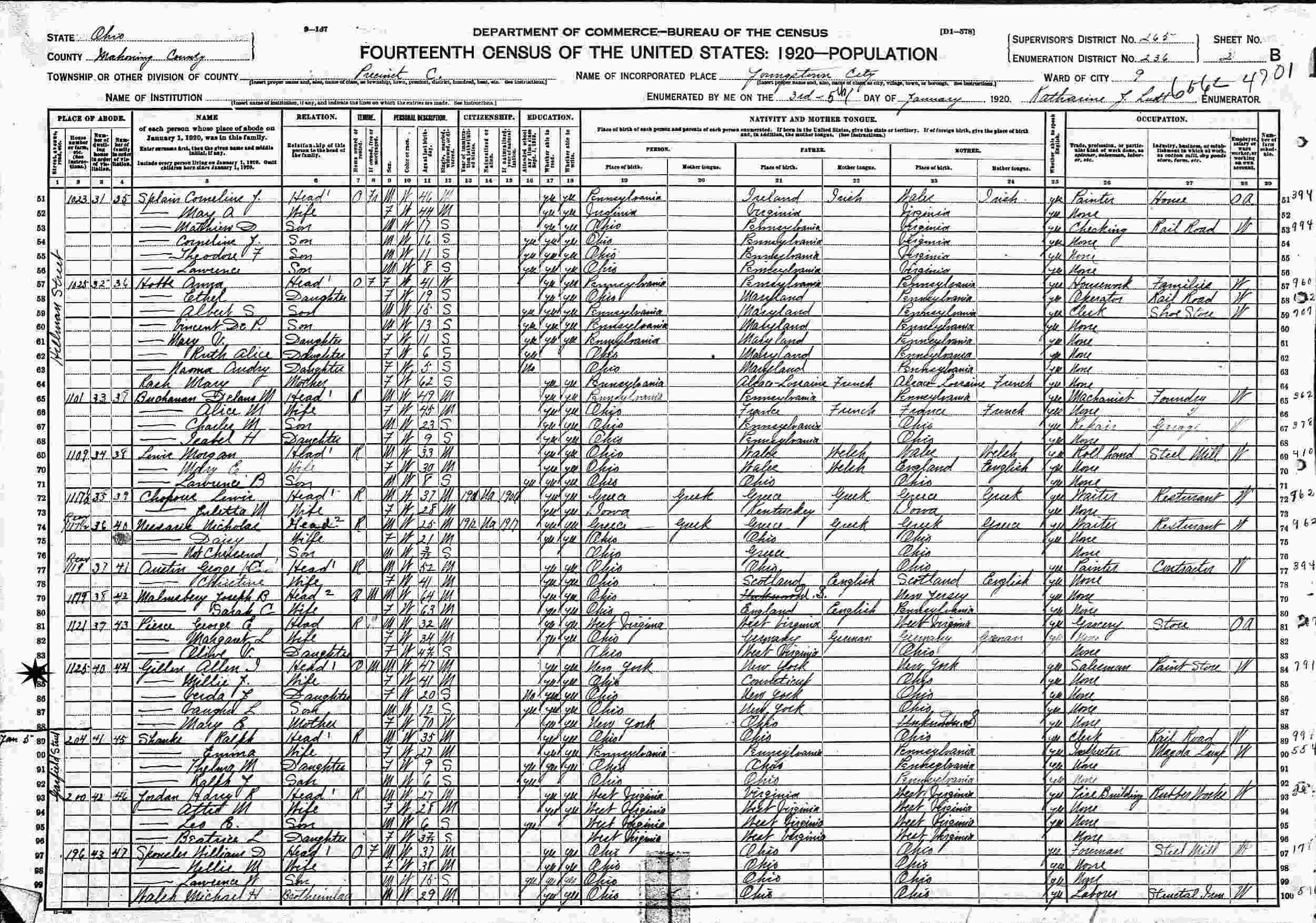 January 3-5, 1920 - 1125 Hillman Street, Precinct C, Ward 9, Supervisor's District 265, Enumeration District 236, Youngstown City, Mahoning County, Ohio.