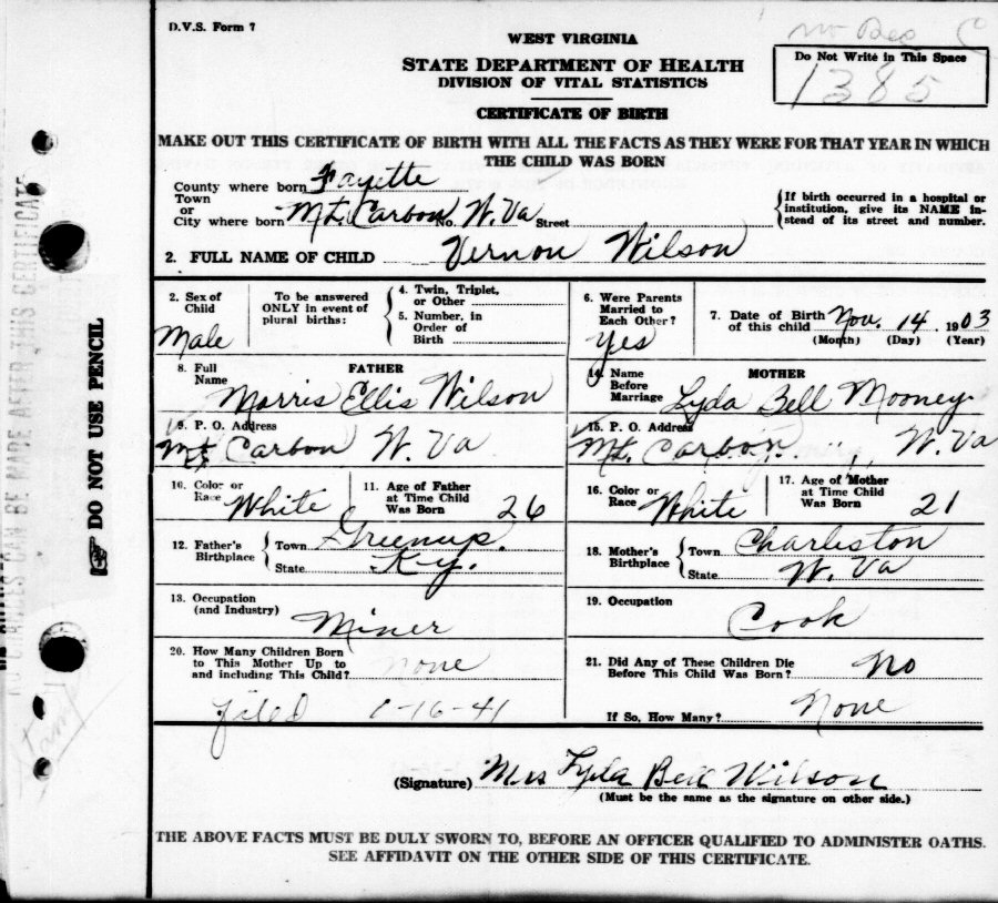 Born: November 14, 1903 in Mt. Carbon, Fayette, County, West Virginia.
