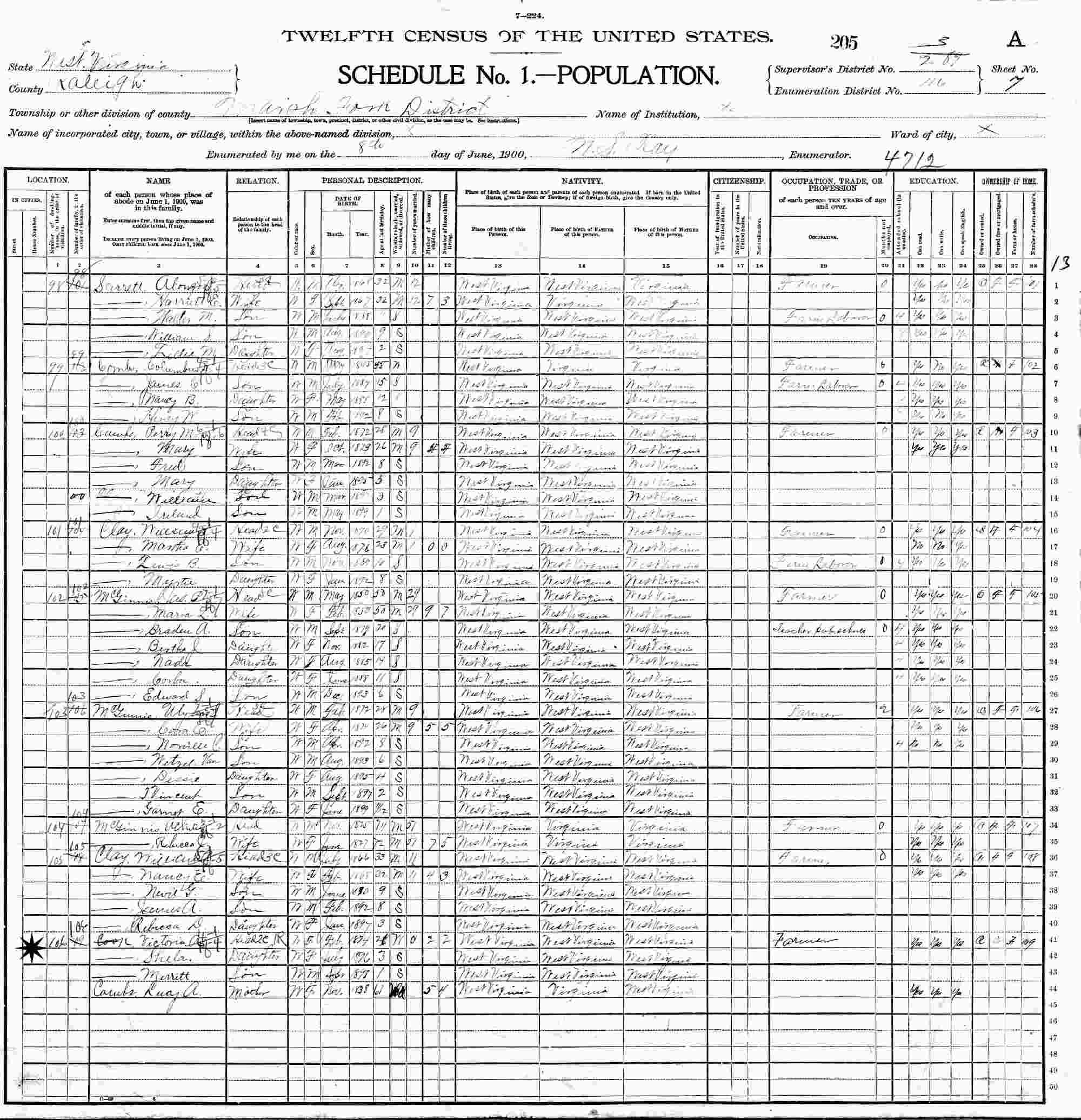 June 8, 1900 - Supervisor's District 289 (crossed out to 2), Enumeration District 116, Marsh Fork District, Raleigh County, West Virginia.
