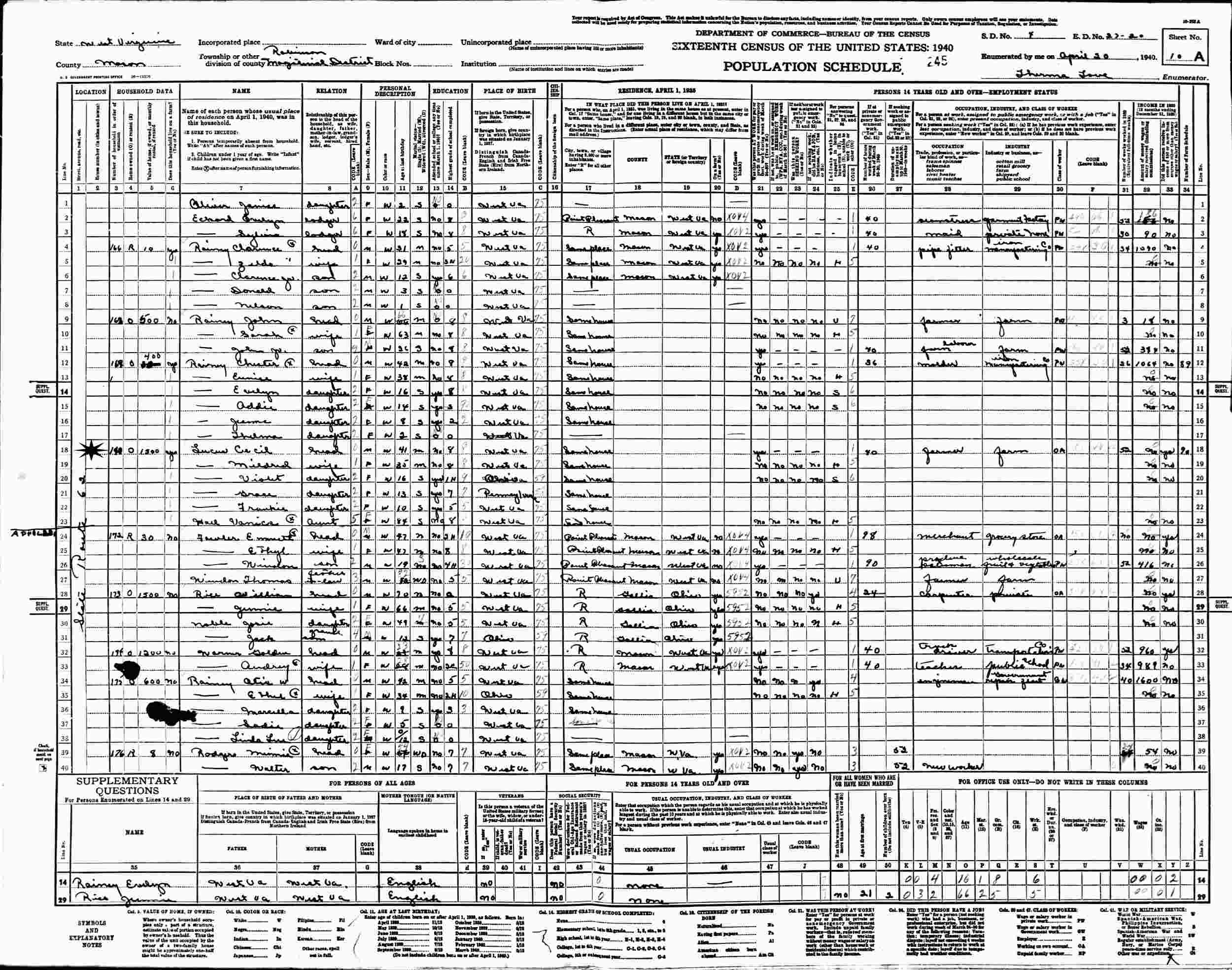 April 23-24, 1930 - River Grand Road, Supervisor's District 6, Enumeration District 27-19, Robinson Magisterial District, Mason County, West Virginia.