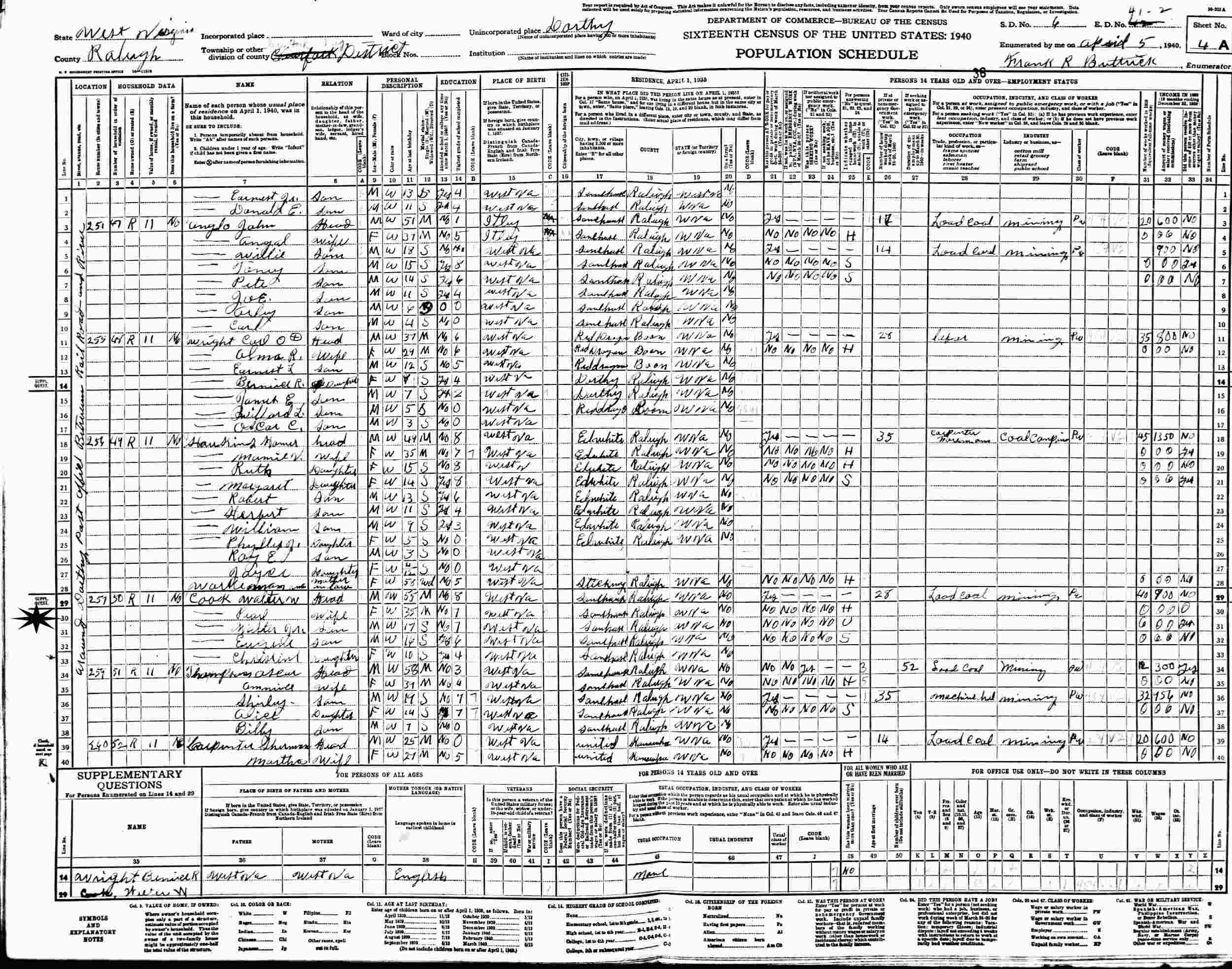 April 5, 1940 - Around Dorothy, Post Office Between Railroad and River, Supervisor's District 6, Enumeration District 42 (crossed out to 41-2), Clear Fork Magisterial District, Dorothy, Raleigh County, West Virginia.
