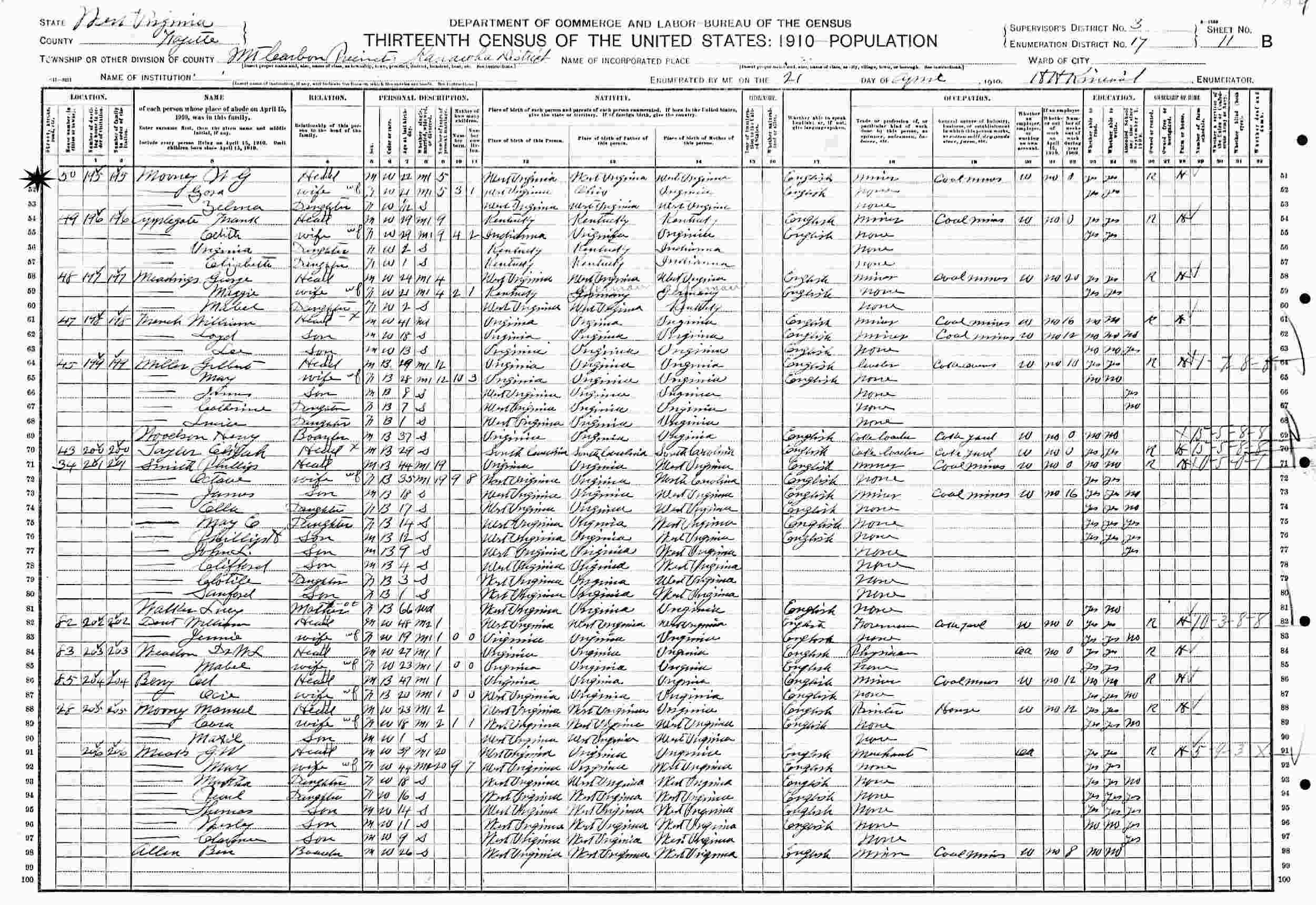 April 21, 1910 - Supervisor's District 3, Enumeration District 17, Mt. Carbon Precinct, Kanawha District, Fayette County, West Virginia.