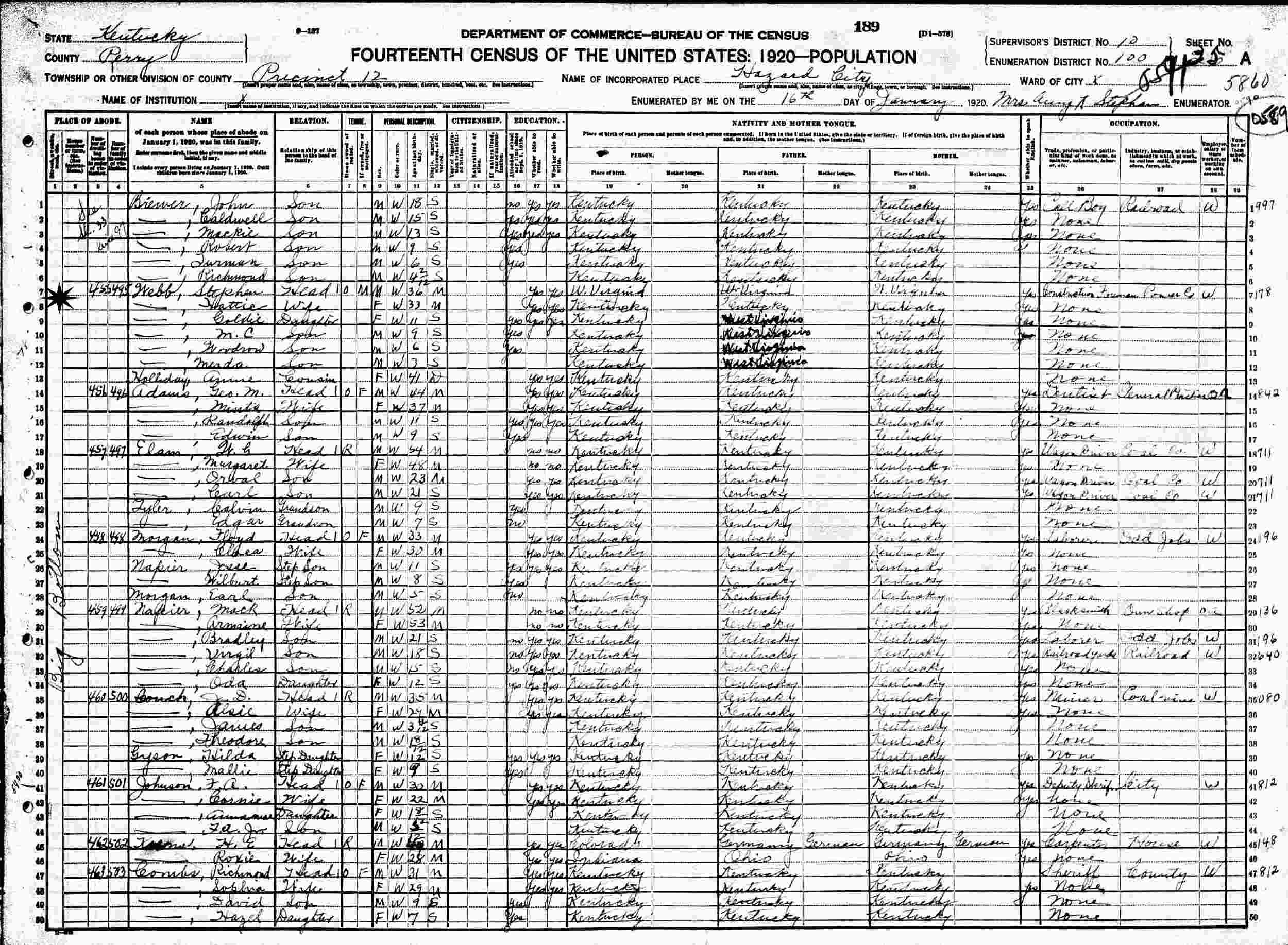 January 15, 1920 - Big Bottom, Hazard ity, Precinct 12, Supervisor's District 10, Enumertion District 100, Perry County, Kentucky.