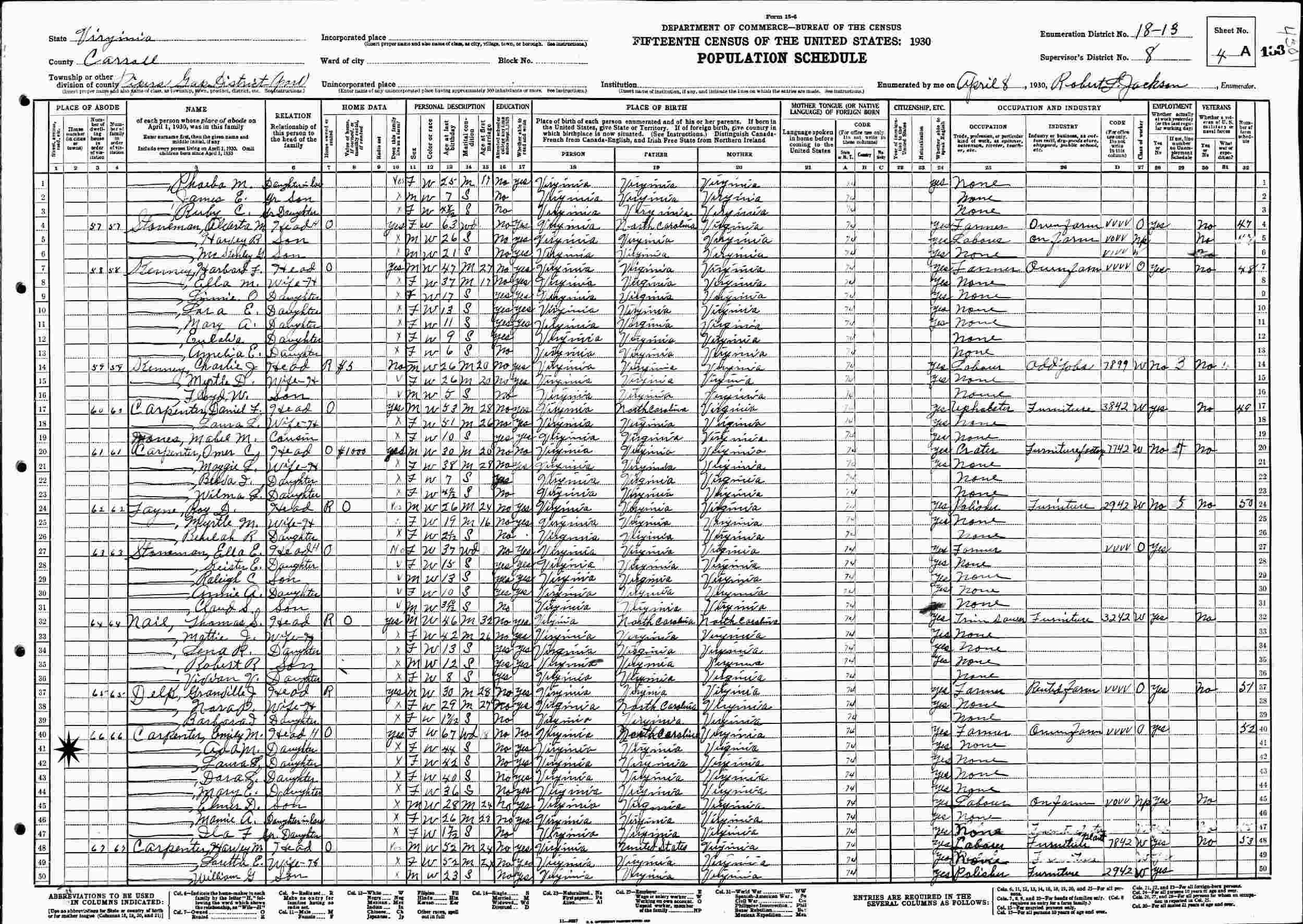 April 8, 1930 - Piper's Gap, Supervisor's District 8, Enumeration District 18-13, Carroll County, Virginia.