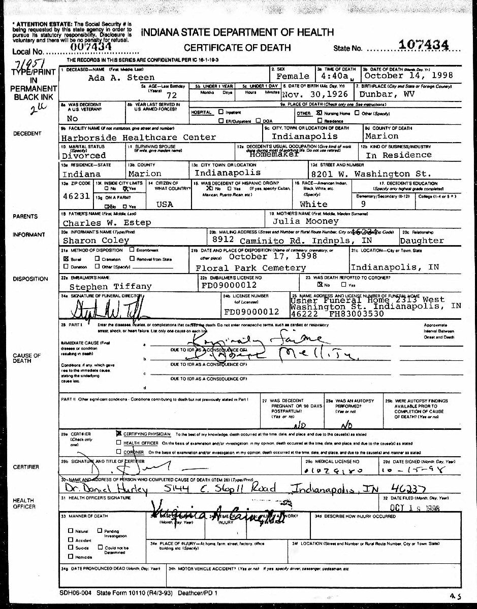 Died: October 14, 1998 in Harborside Heathcare Center, Indianapolis, Marion County, Indiana.
