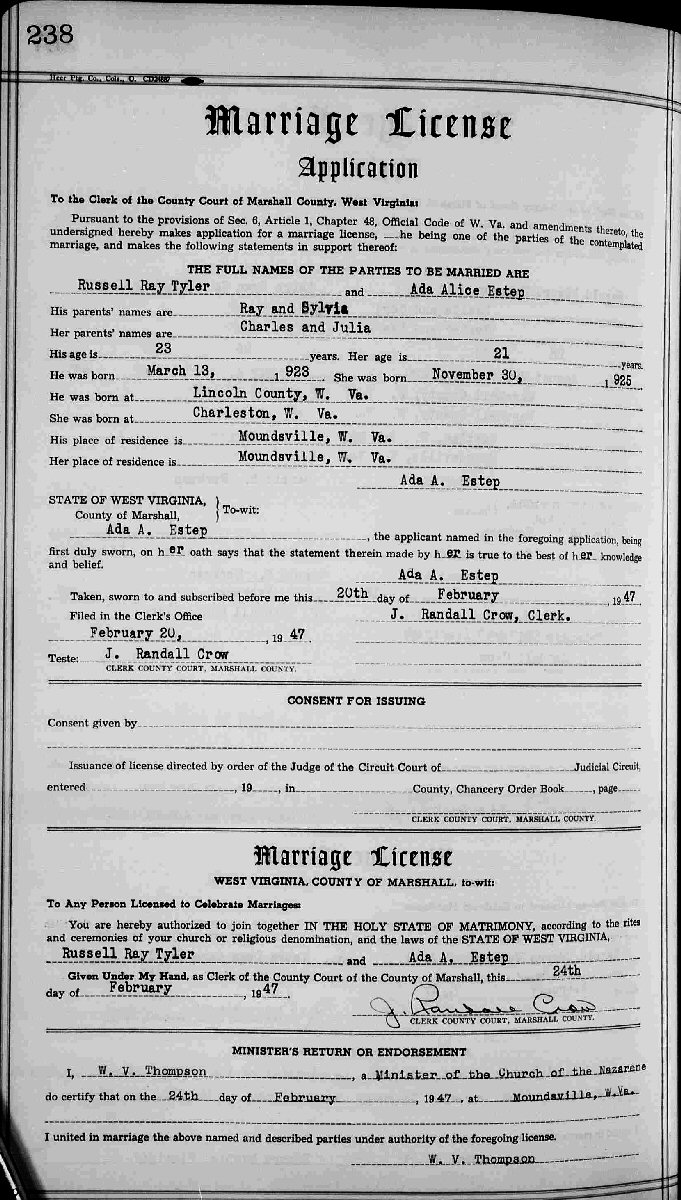 Married: (1) Russell Ray Tyler February 24, 1947 in Moundsville, Marshall County, West Virginia.