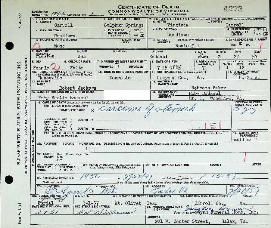 Died: February 27, 1957 in Woodlawn, Carroll County, Virginia.