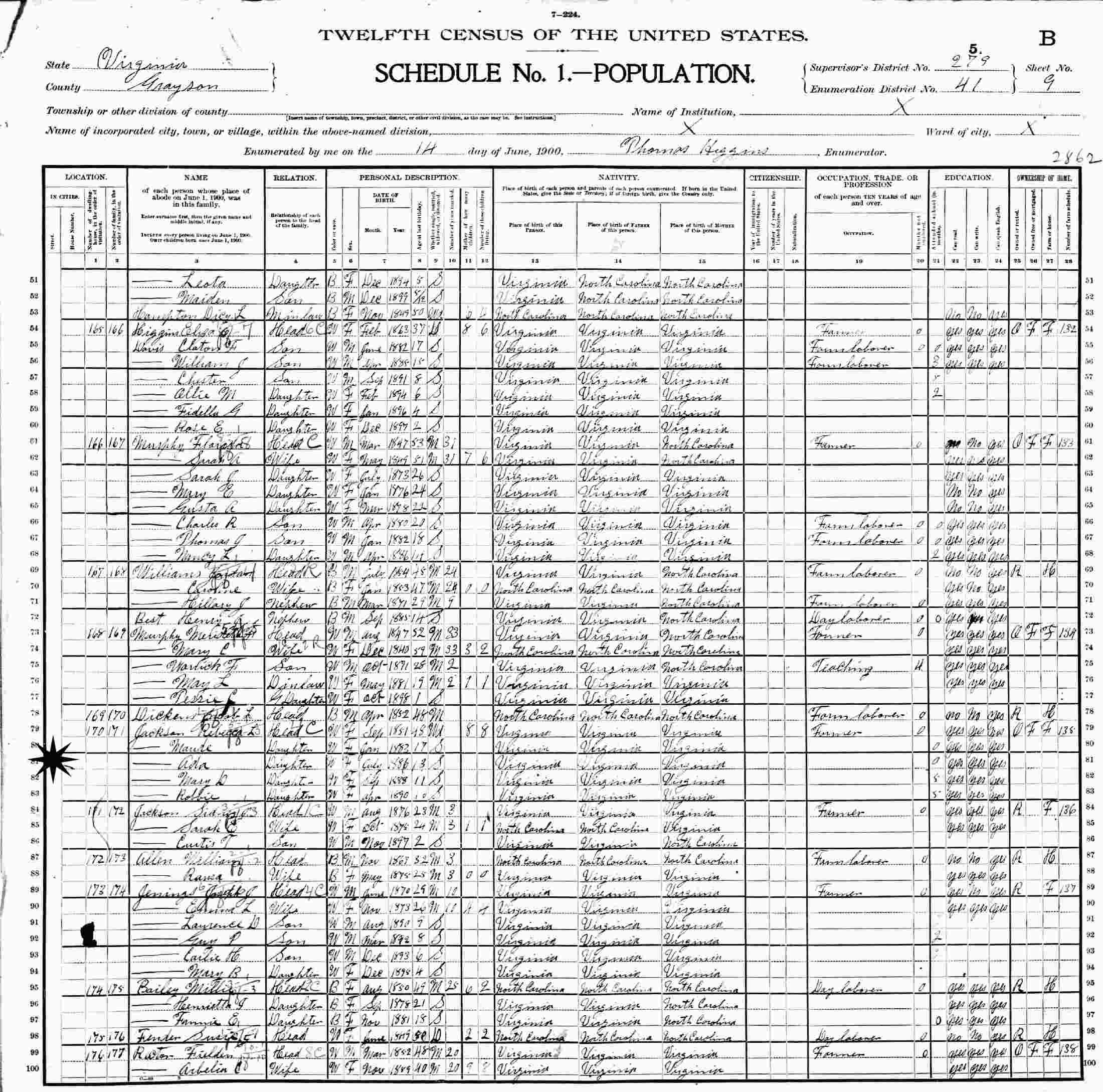 June 14, 1900 - Oldtown, Supervisor's District 279, Enumeration District 41, Grayson County, Virginia.