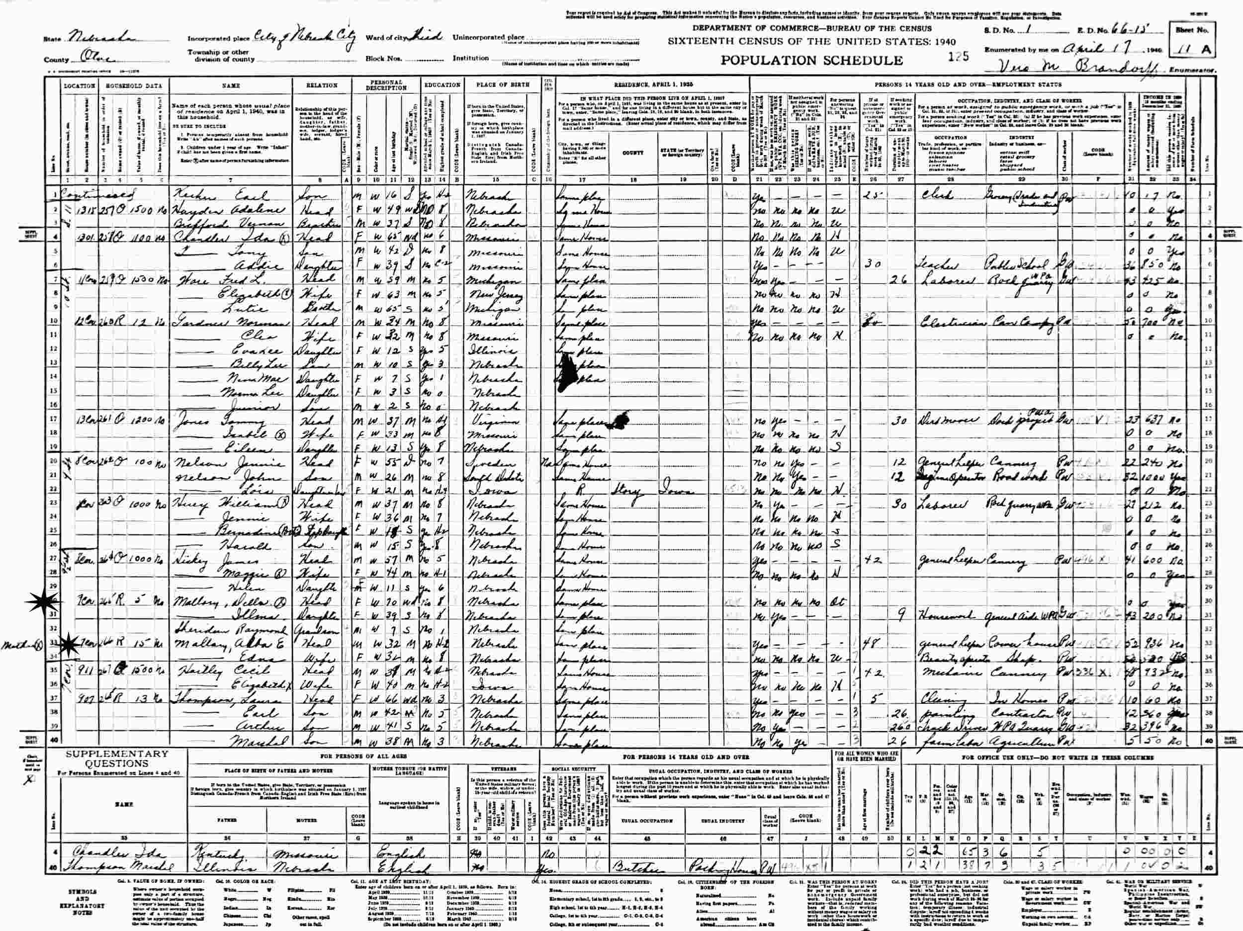 April 17, 1940 - 9 1/2 Street, 7 Corner, Ward 3, Supervisor's District 1, Enumeration 66-15, Nebraksa City, Otoe County, Nebraska.