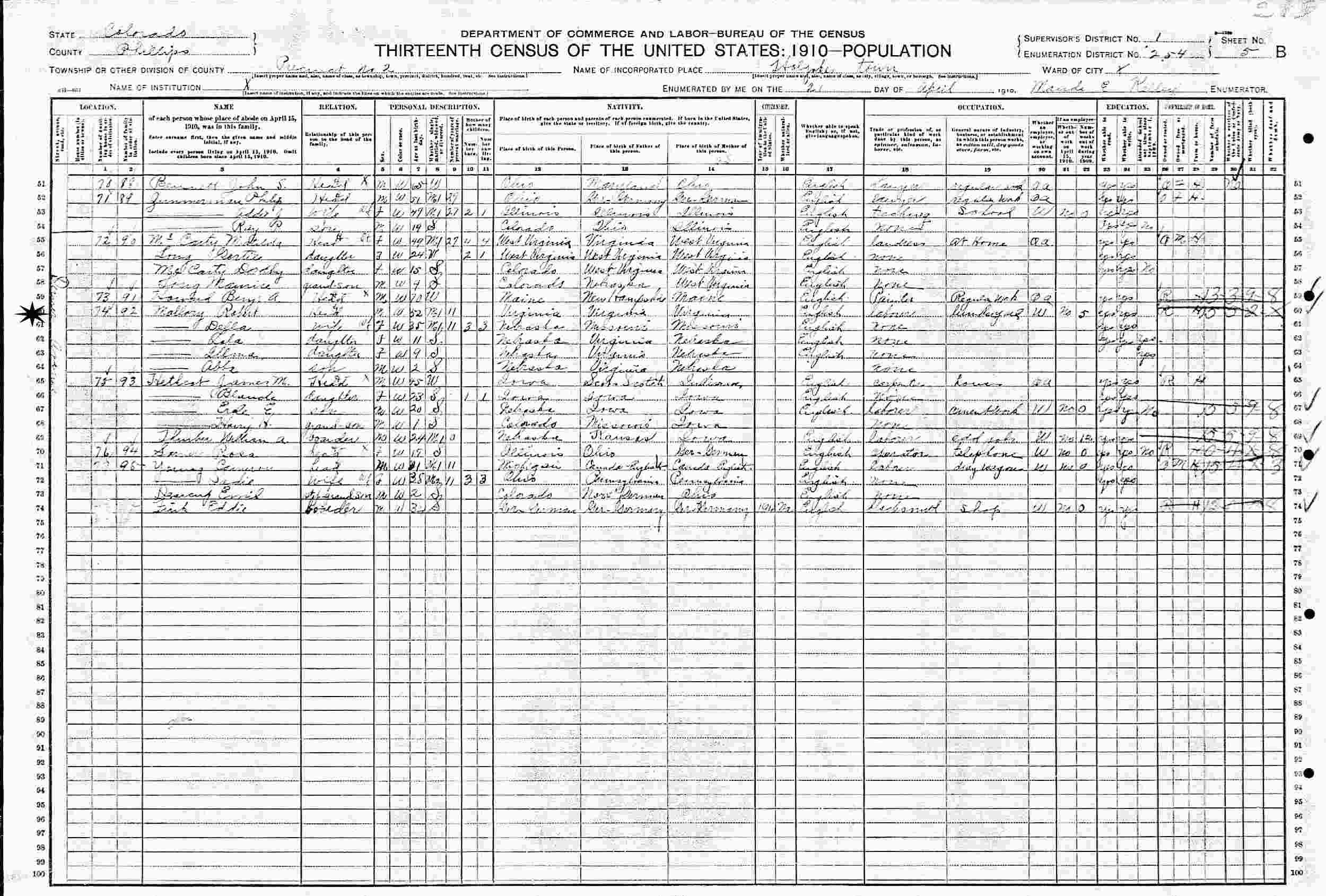 April 21, 1910 - Denver Avenue, Holyoke Town, Precinct 2, Supervisor's District 1, Enumeration District 254, Phillips County, Colorado.