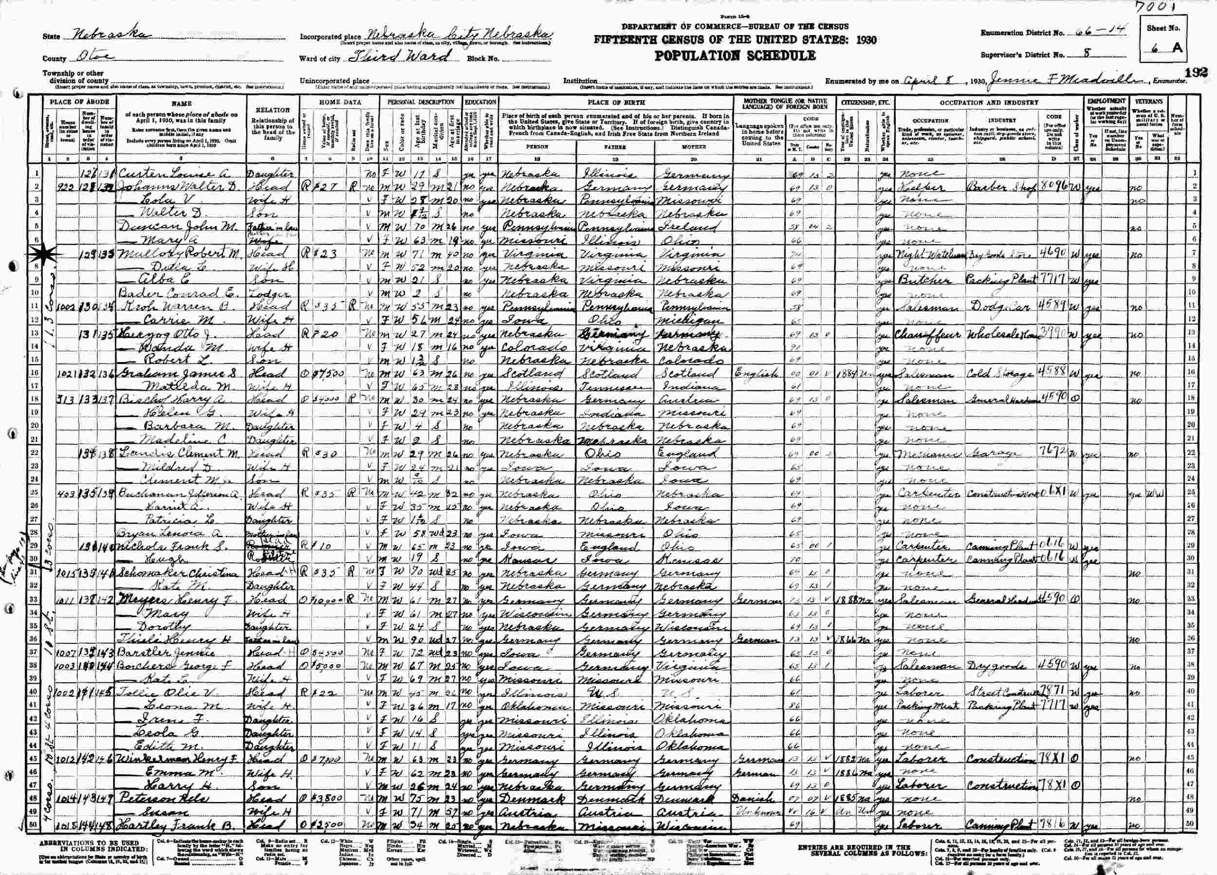 April 8, 1930 - Ward 3, Supervisor's District 8, Enumeration District 66-14, Nebraska City, Otoe County, Nebraska.
