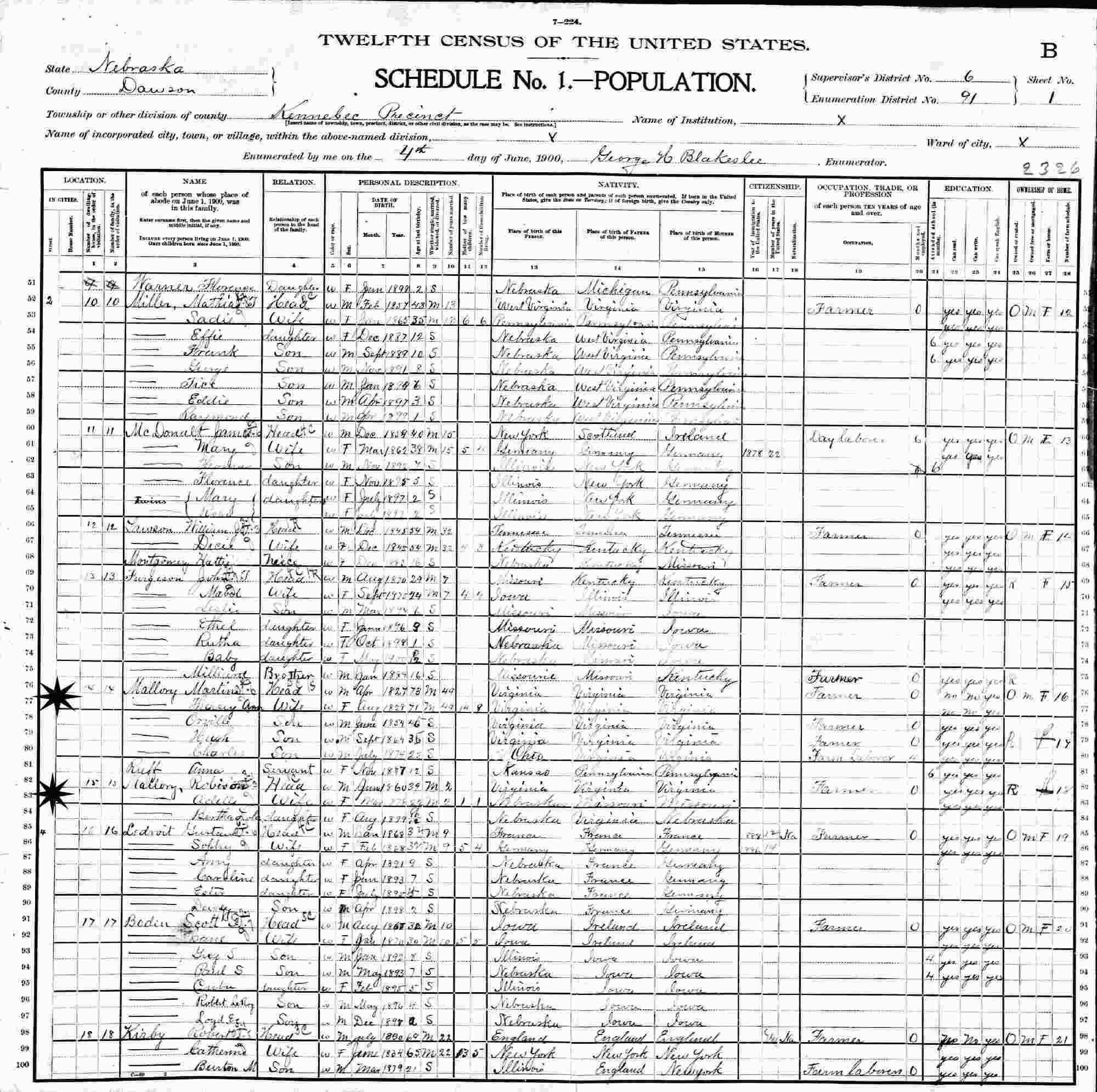 June 4, 1900 - Supervisor's District 6, Enumeration District 91, Kennebec, Dawson County, Nebraska.