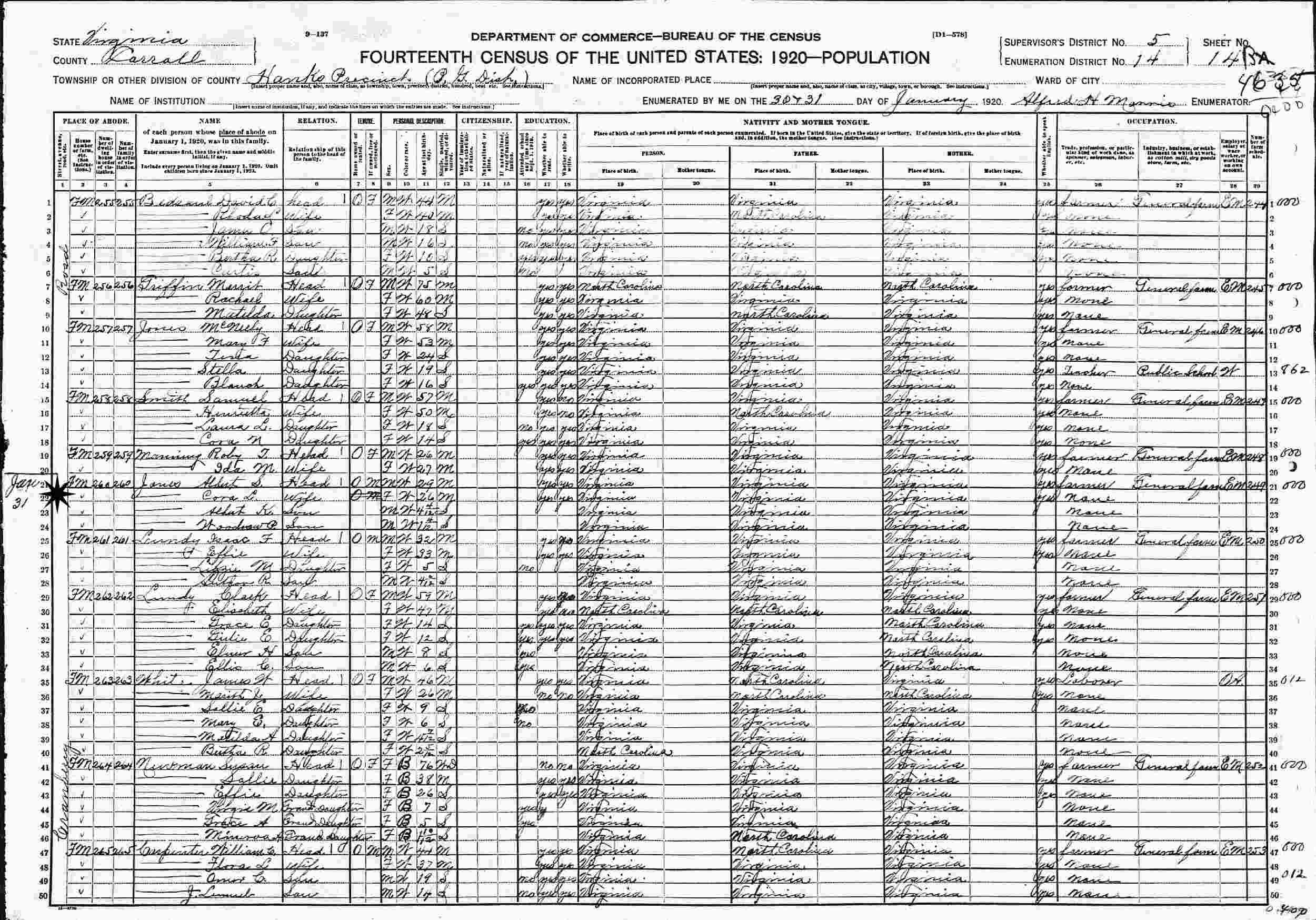 January 31, 1920 - Cranberry Road, Hanks Precinct, Supervisor's District 5, Enumeration District 14, Pipers Gap District, Carroll County, Virginia.