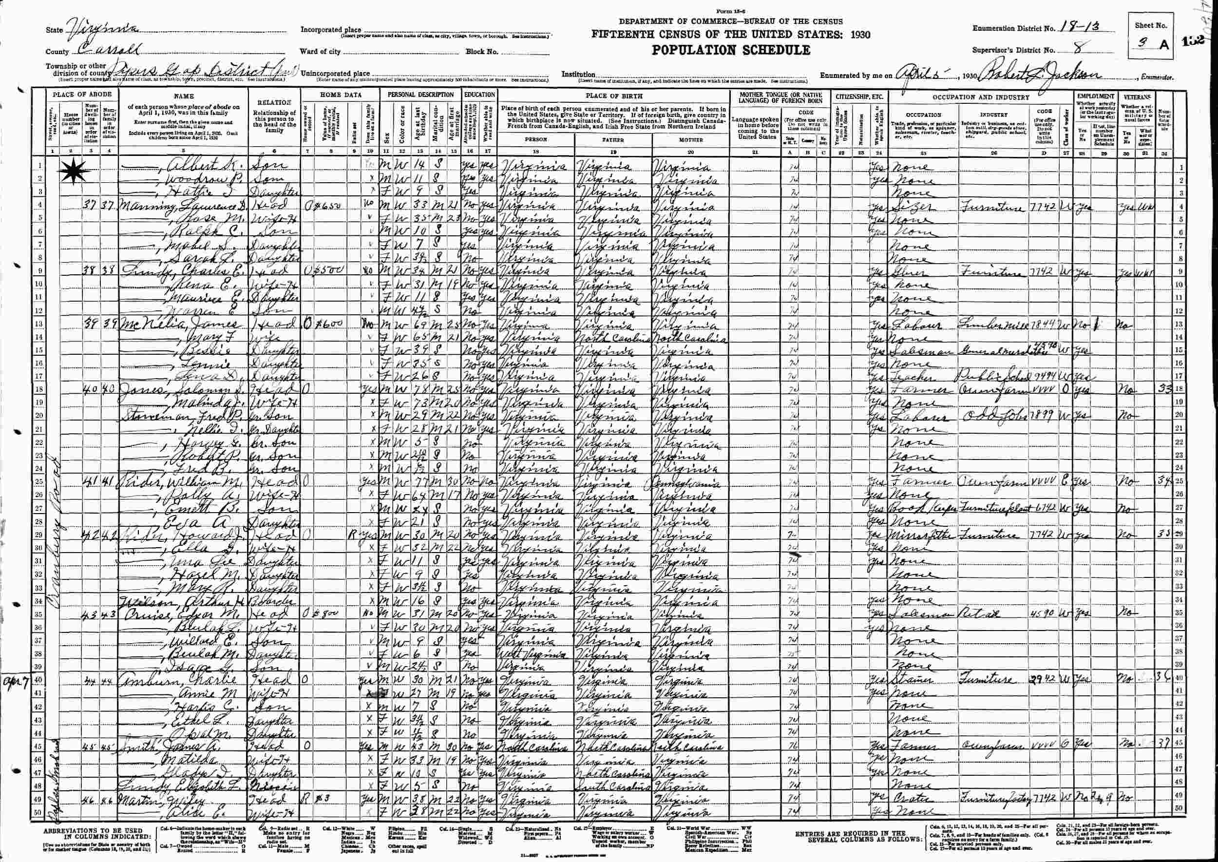 April 8, 1940 - 510 Main Street, Supervisor's District 5, Enumeration District 39-6, Oldtown, Galax, Grayson County, Virginia (w/mother).