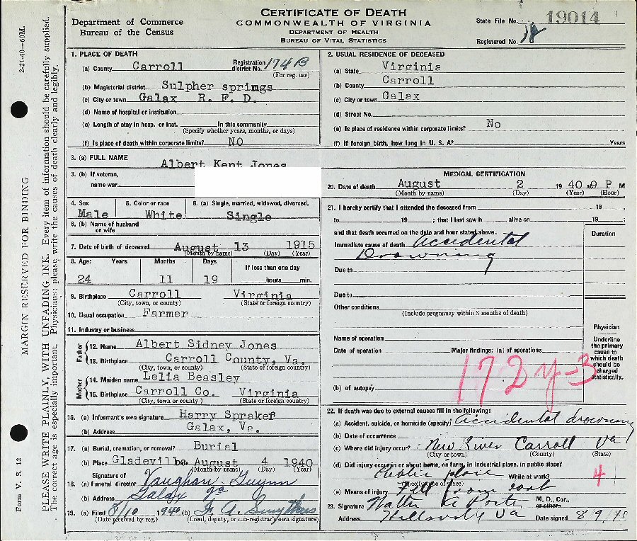 Died: August 2, 1940 in Galax, Carroll County, Virginia.