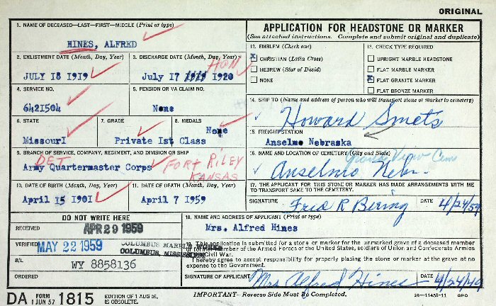 Military Service: July 18, 1919-July 17, 1920 - Army Quartermaster Corps, Fort Riley, Kansas.
