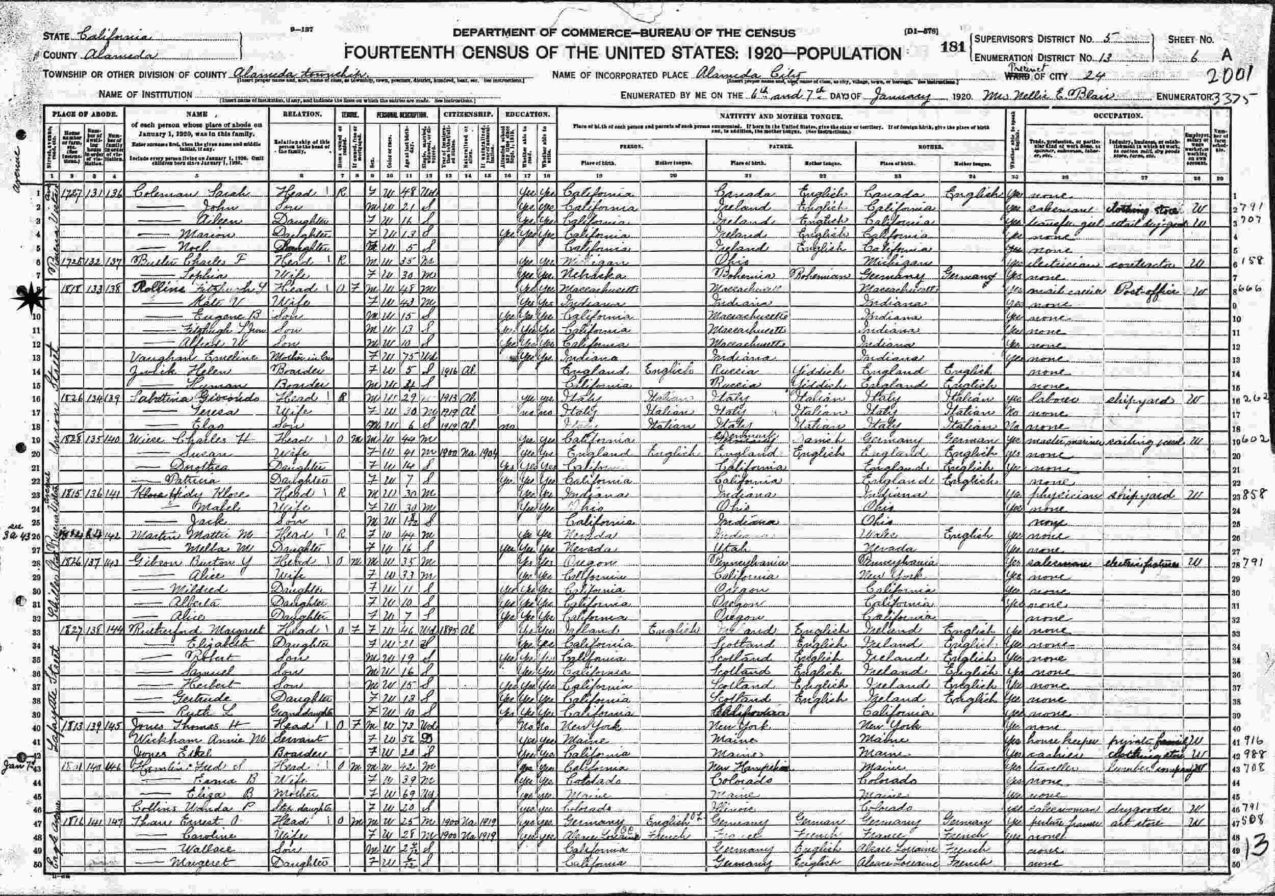 January 6-7, 1920 - 1818 Union Street, Ward 24, Supervisor's District 5, Enumeration District 13, Alameda, Alameda County, California.