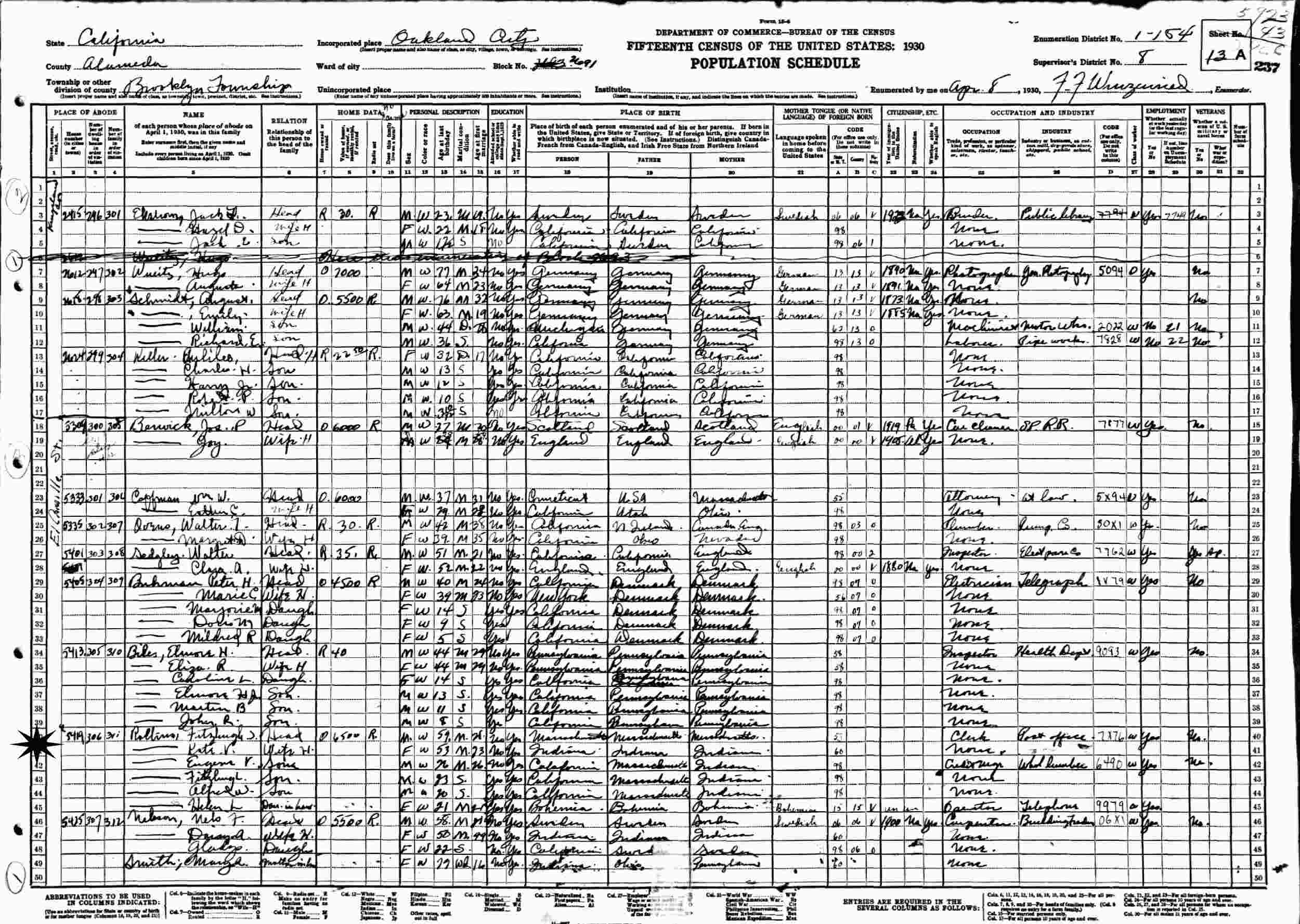 April 8, 1930 - 5419 El Camille Street, Block 2691, Supervisor's District 8, Enumeration District 1-154, Brooklyn Township, Oakland City, Alameda County, California.