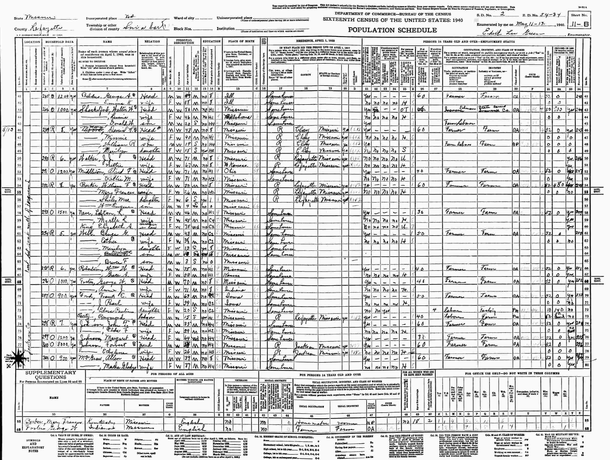 April 4, 1930 - Supervisor's District 6, Enumeration District 54-30, Sniabar Township, Lafayette County, Missouri.