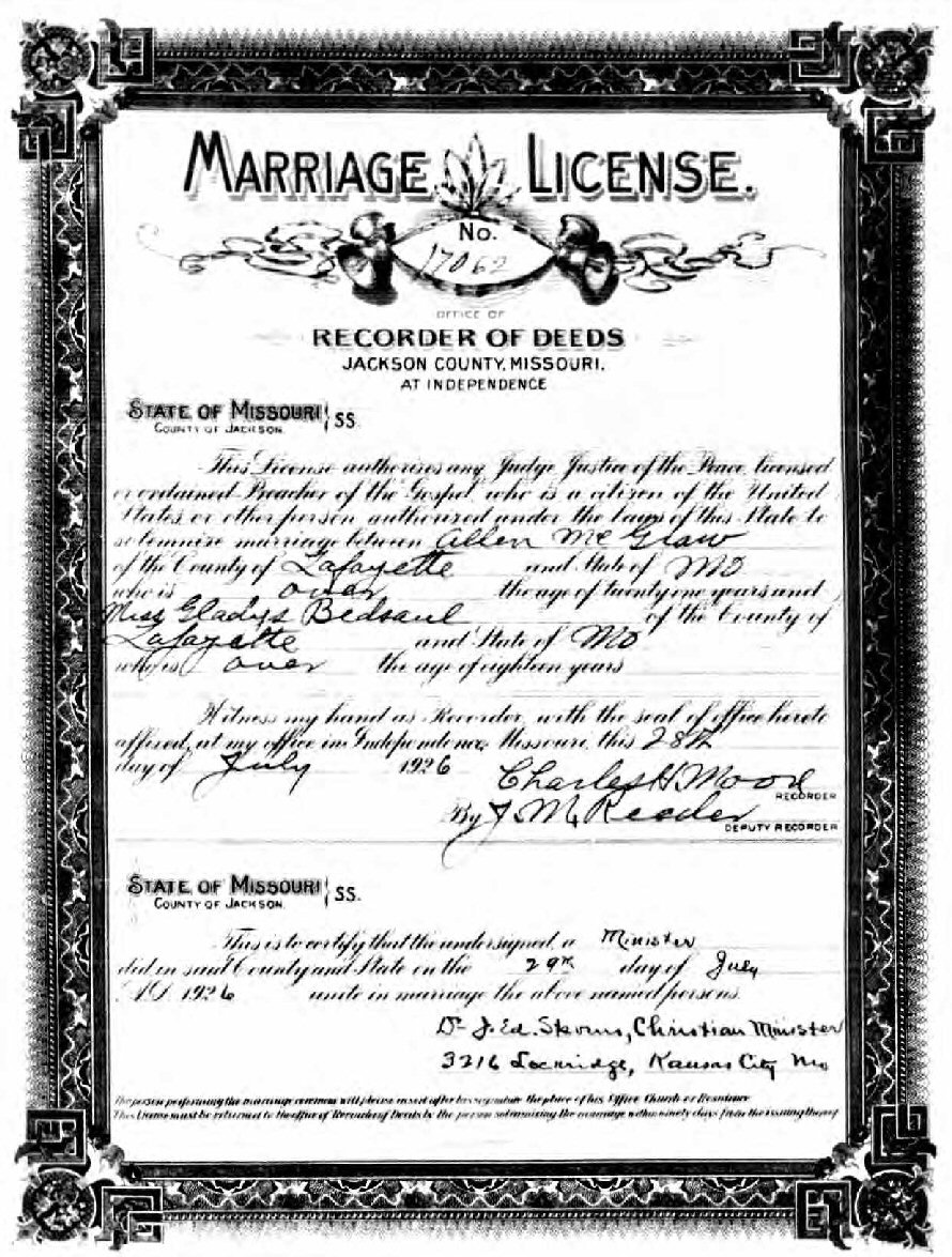 Married: Gladys Martha "Mattie" Bedsaul July 29, 1926 in Jackson County, Missouri.