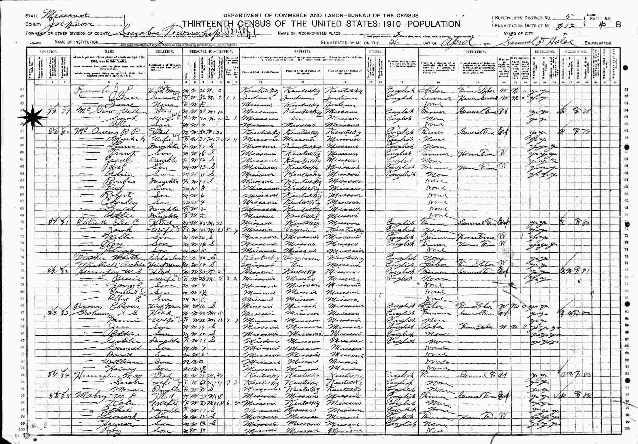 April 26, 1910 - Sniabar Township, Supervisor's District 5, Enumeration District 212, Jackson County, Missouri.