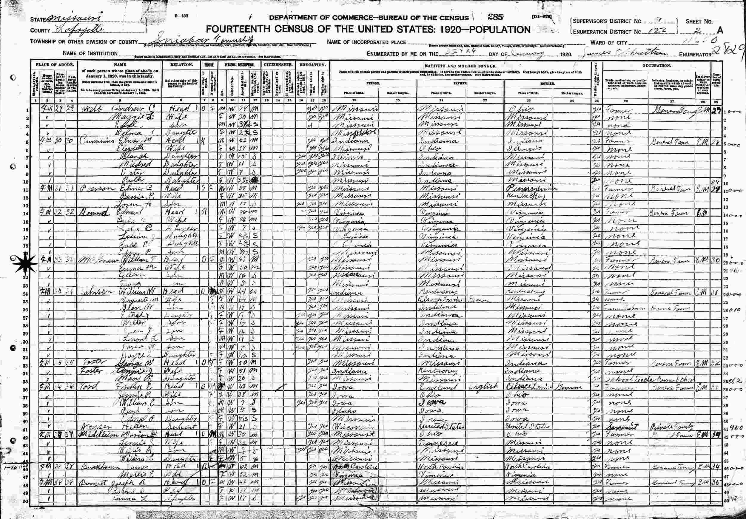January 22-26, 1920 - Sniabar Township, Supervisor's District 7, Enumeration District 122, Lafayette County, Missouri.