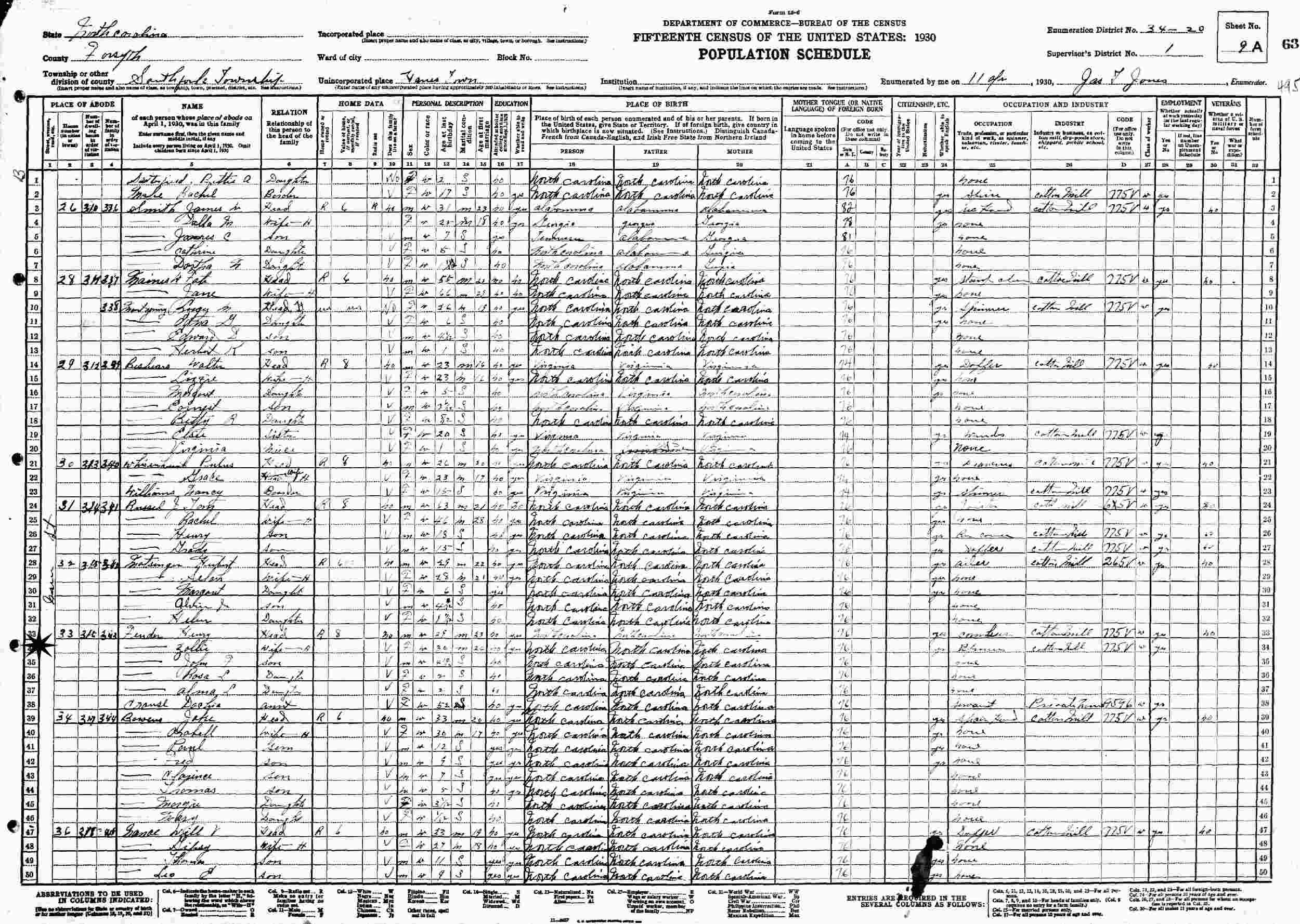 April 11, 1930 - Hanes Town, Supervisor's District 1, Enumeration District 34-20, Southfork Township, Forsyth County, North Carolina.