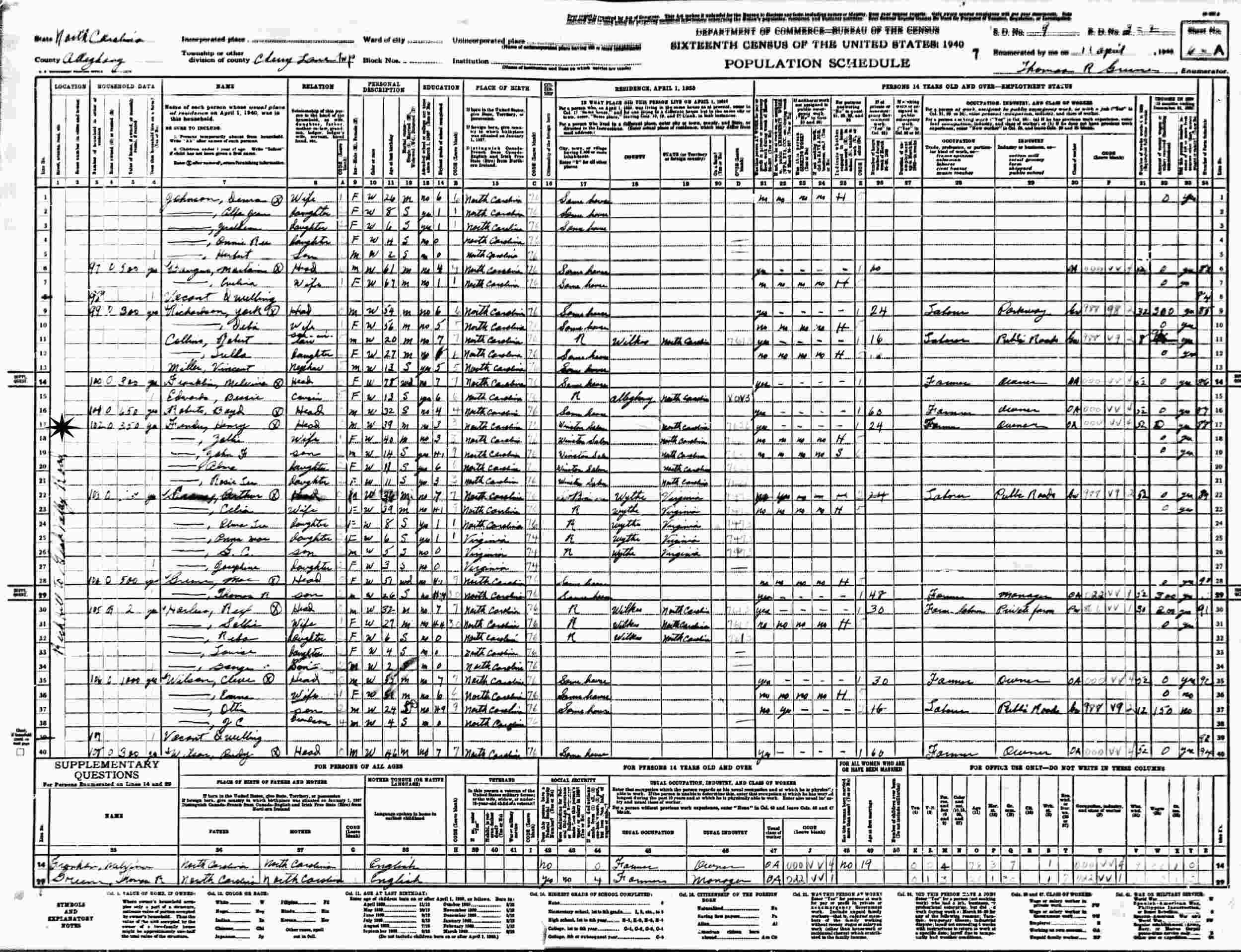 April 11, 1940 - Rich Hill to Glade Valley Road, Supervisor's District 9, Enumeration District 2-2, Cherry Lane Township, Alleghany County, North Carolina.