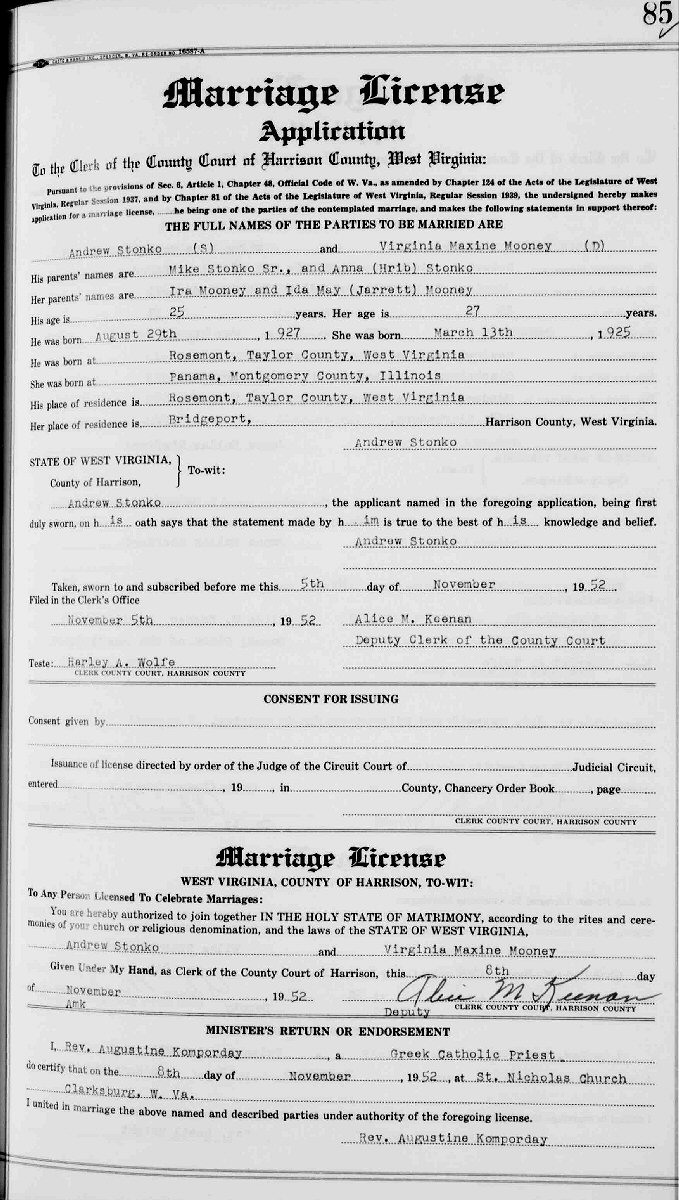 Married: Virginia Maxine Mooney 1942 in Barbour County, West Virginia. (Divorce: 1949, Volusia County, Florida.)