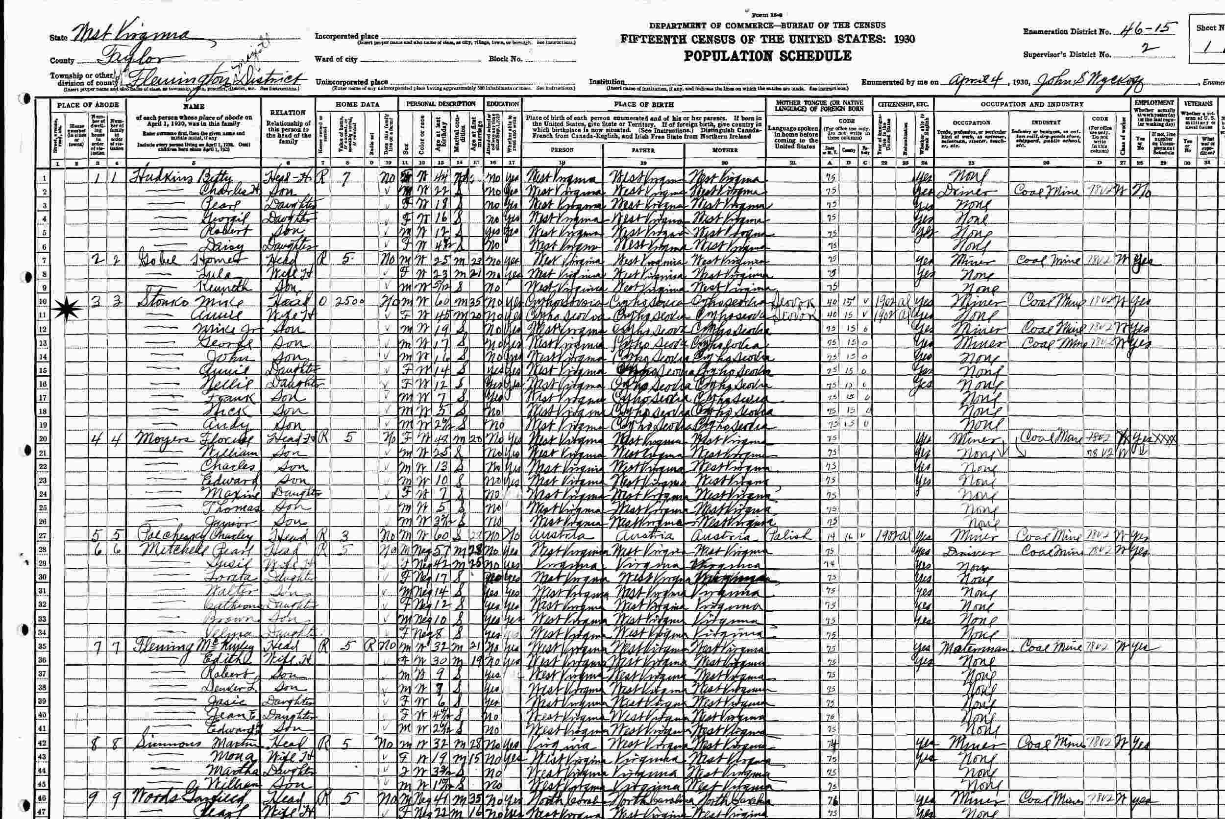 April 04, 1930 - Supervisor's District 46-15, Enumeration District 2, Flemington Magisterial District, Taylor County, West Virginia.