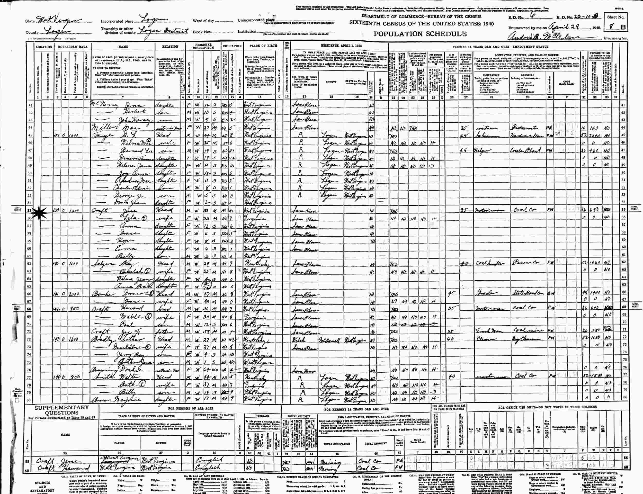 April 29, 1940 - Supervisor's District 6, Enumeration District 23-18B, Logan District, Logan County, West Virginia.