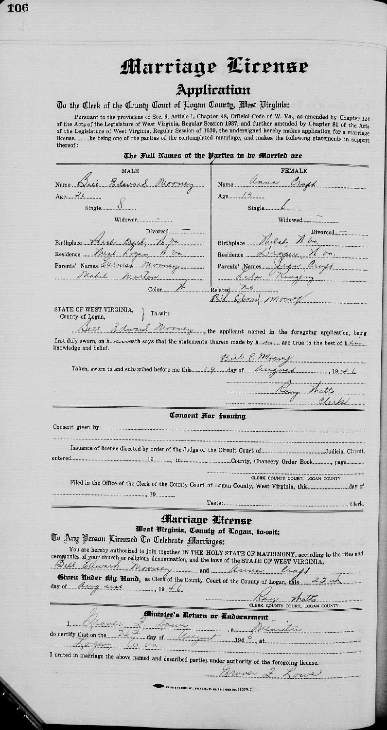 Married: William "Bill" Edward Mooney August 24, 1946 in Logan County, West Virginia.