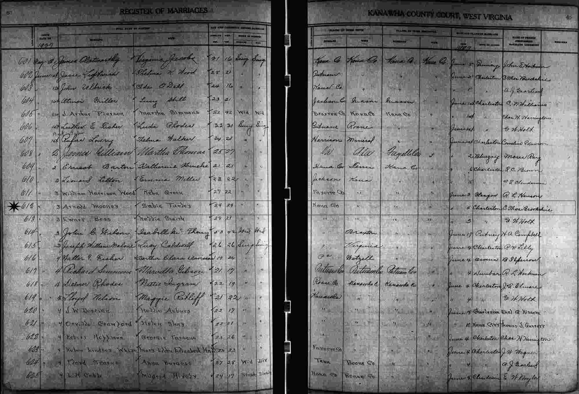 Married: Sabie Cleora Turley June 4, 1927 in Charleston, Kanawha County, West Virginia.
