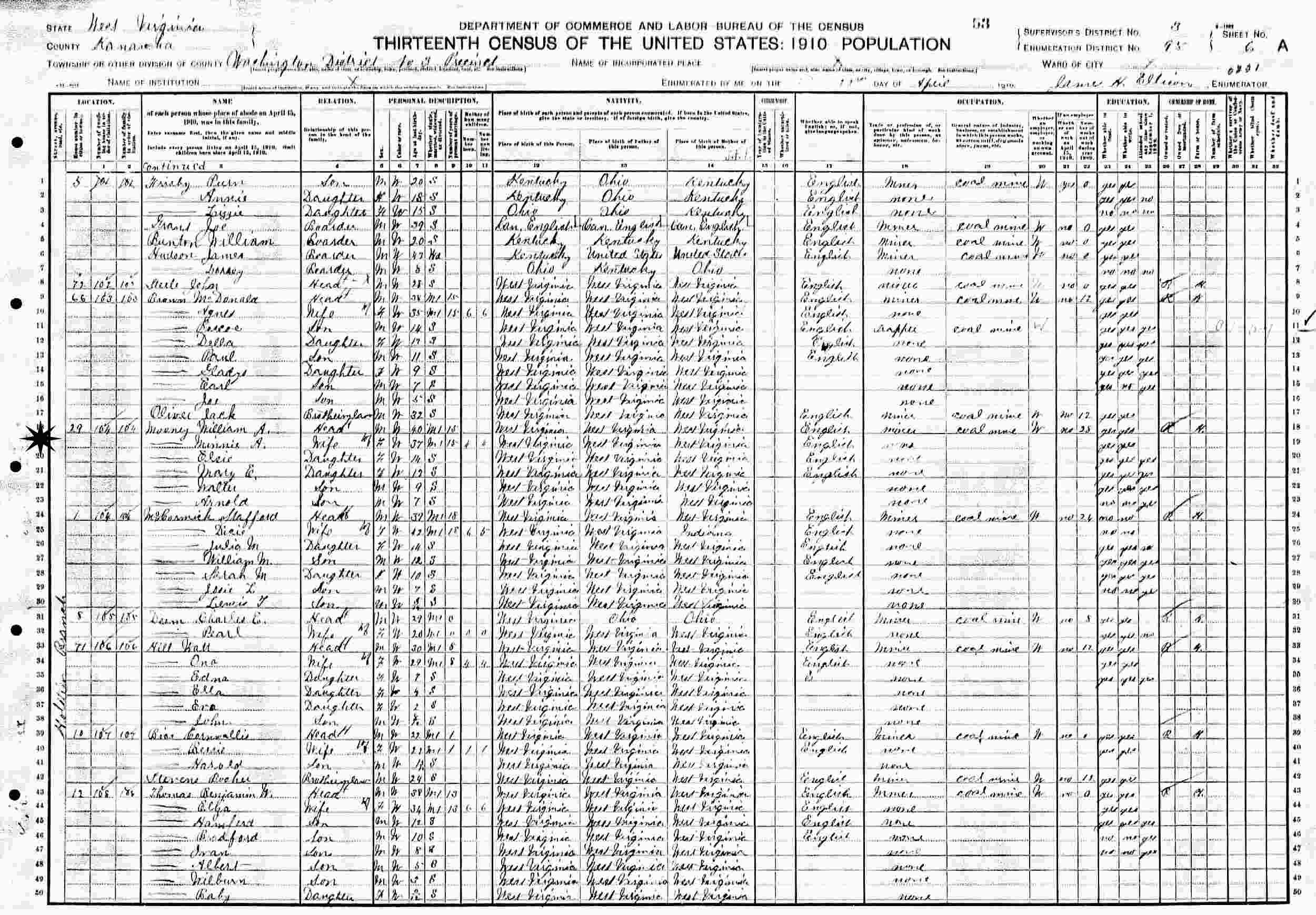 April 13, 1910 - 29 Holstein Branch, Precinct 3, Supervisor's District 3, Enumeration District 95, Washington District, Kanawha County, West Virginia.