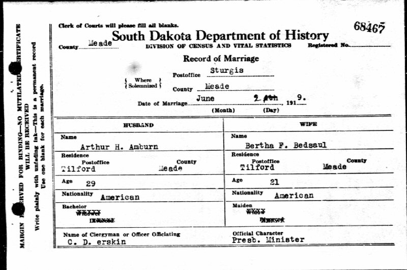 Married: Bertha Frances Bedsaul June 20, 1919 in Tilford, Meade County, South Dakota.