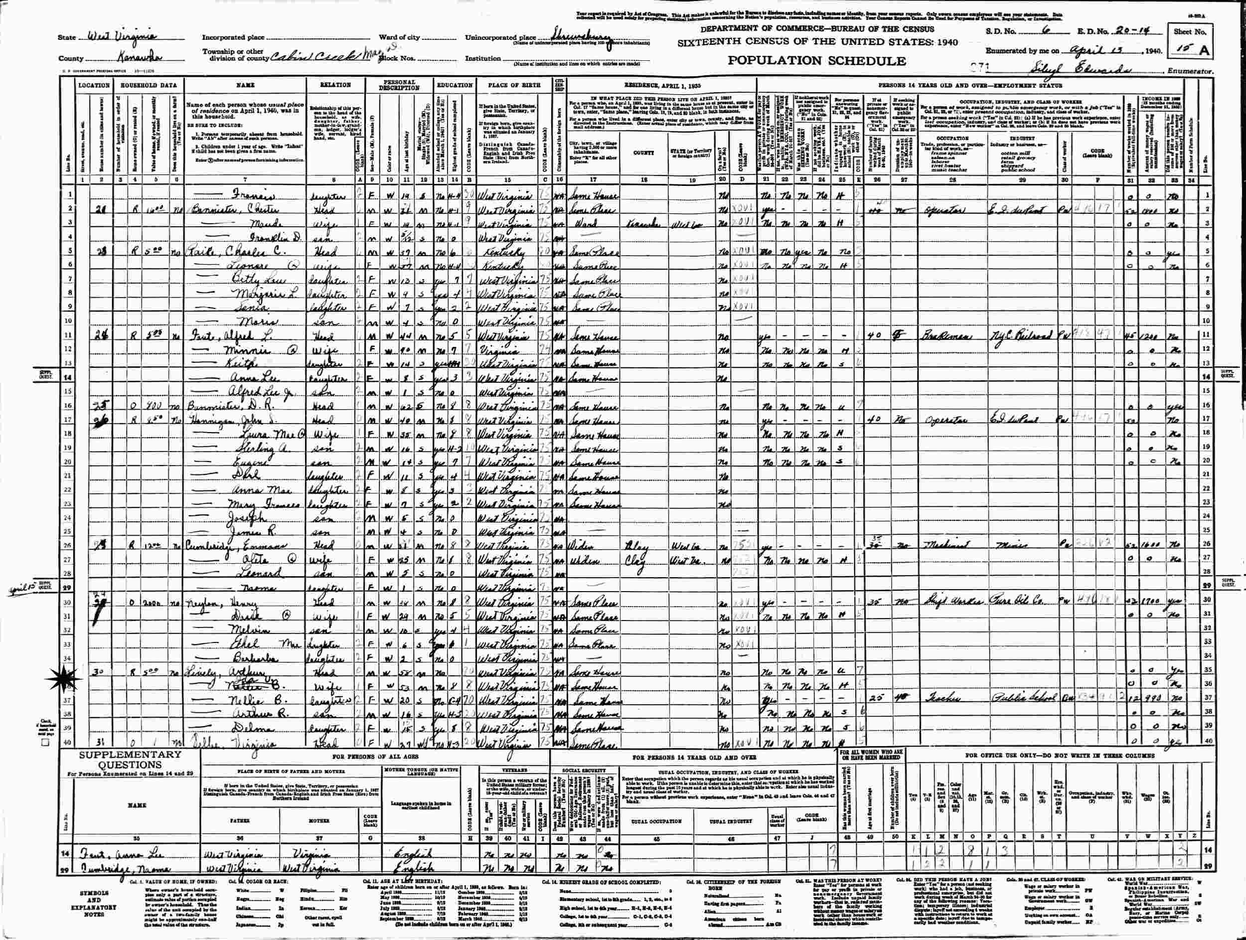April 13, 1940 - Supervisor's District 6, Enumeration District 20-14, Cabin Creek Magisterial District, Shrewsbury, Kanawha County, West Virginia.
