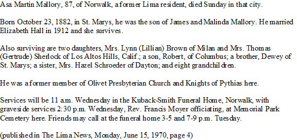 Died: June 13, 1970 in Fisher-Titus Memorial Hospital, Norwalk, Huron County, Ohio. (Death Certificate #045571.)