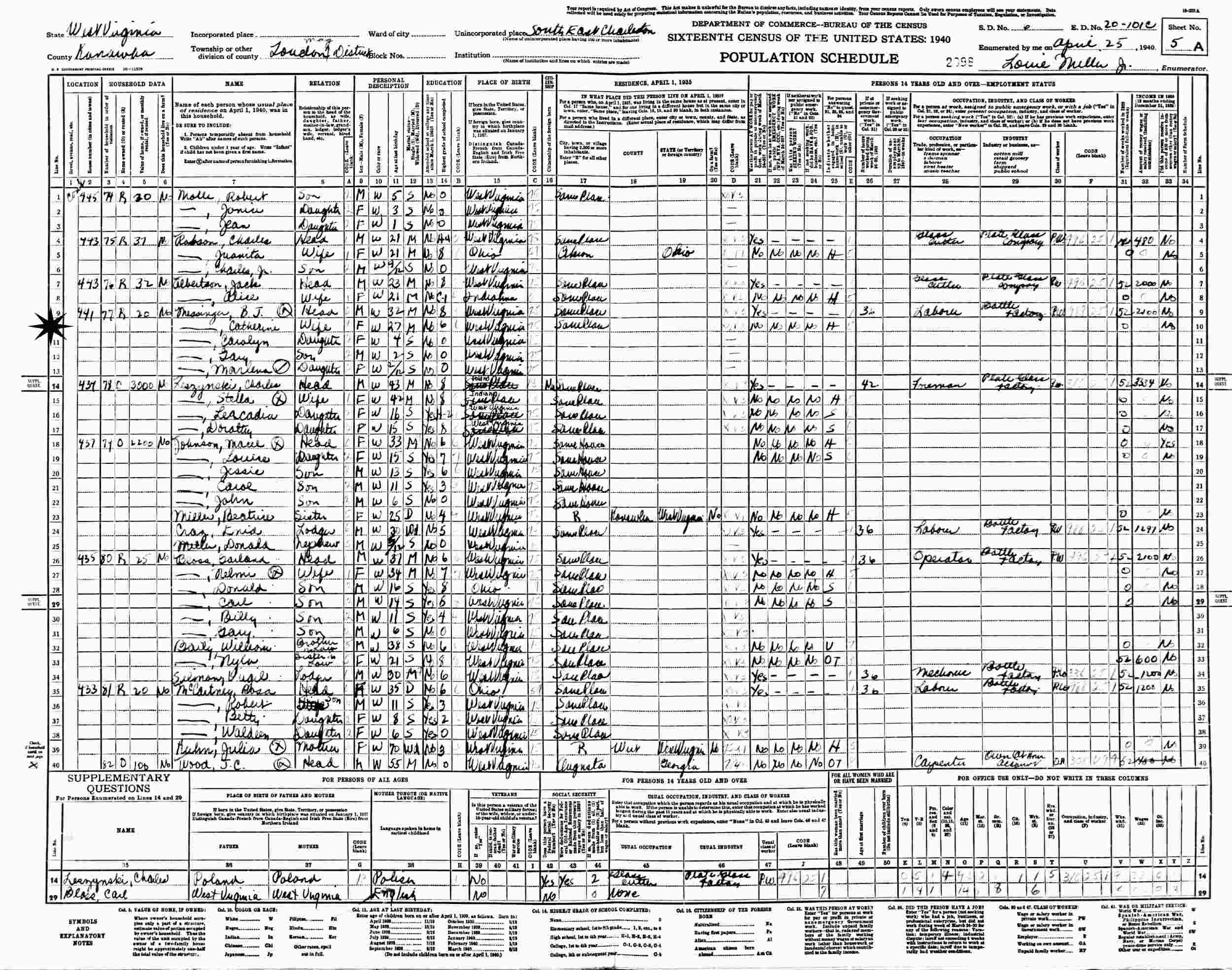 April 25, 1940 - Supervisor's District 6, Enumeration District 20-101C, Loudon Magisterial District, South East Charleston, Kanawha County, West Virginia.
