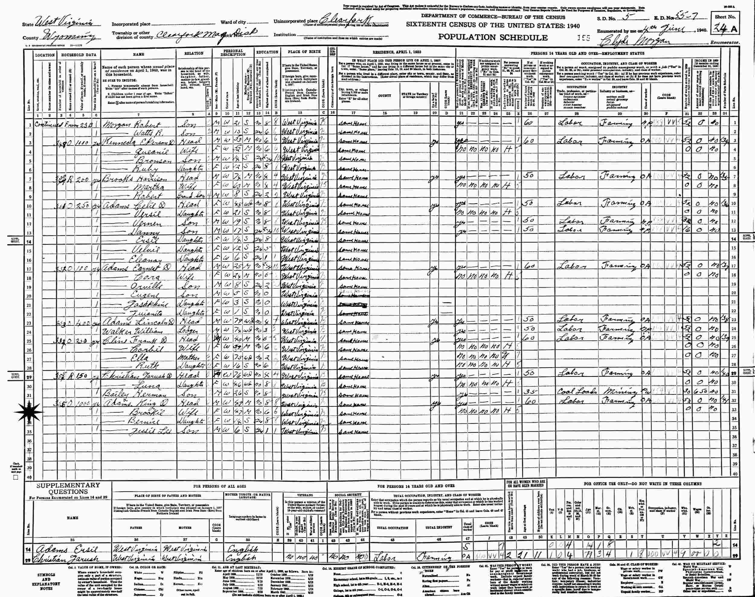June 4, 1940 - Supervisor's District 5, enumeration District 55-7, Clear Fork Magisterial District, Clear Fork, Wyoming County, West Virginia.