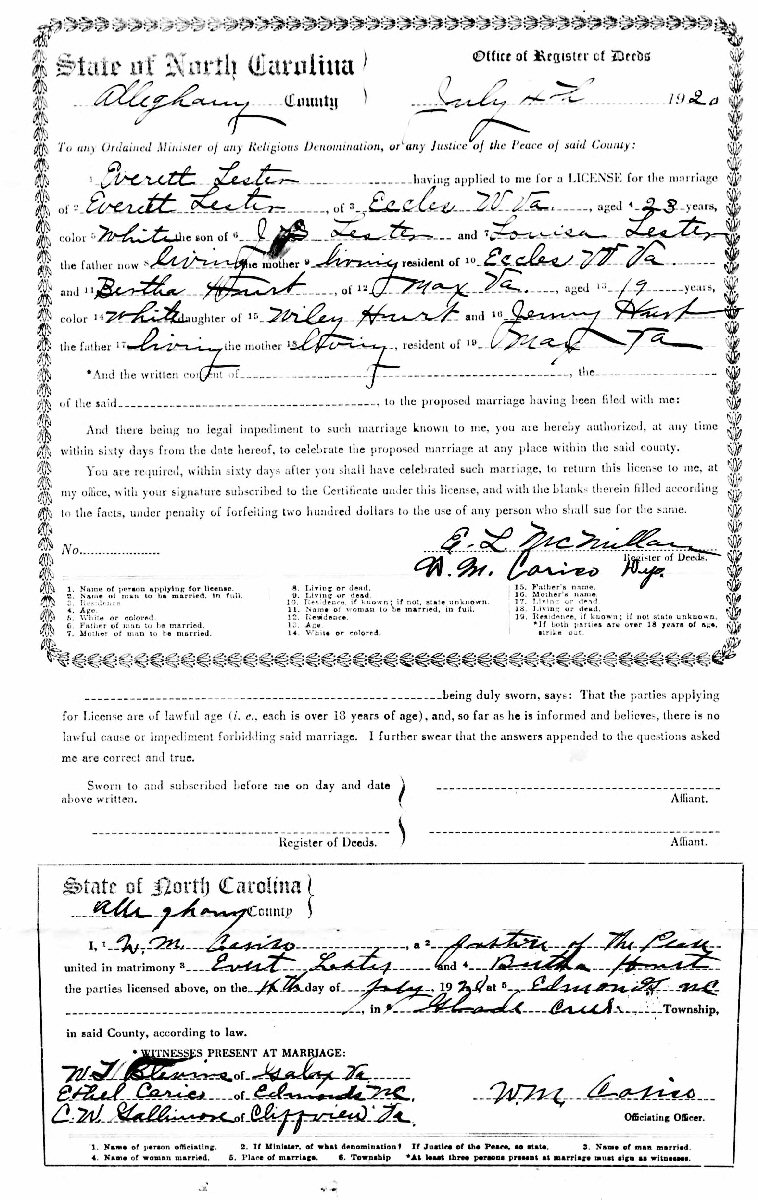 Married: Everett Silas Lester February 4, 1920 in Allgehany County, North Carolina.