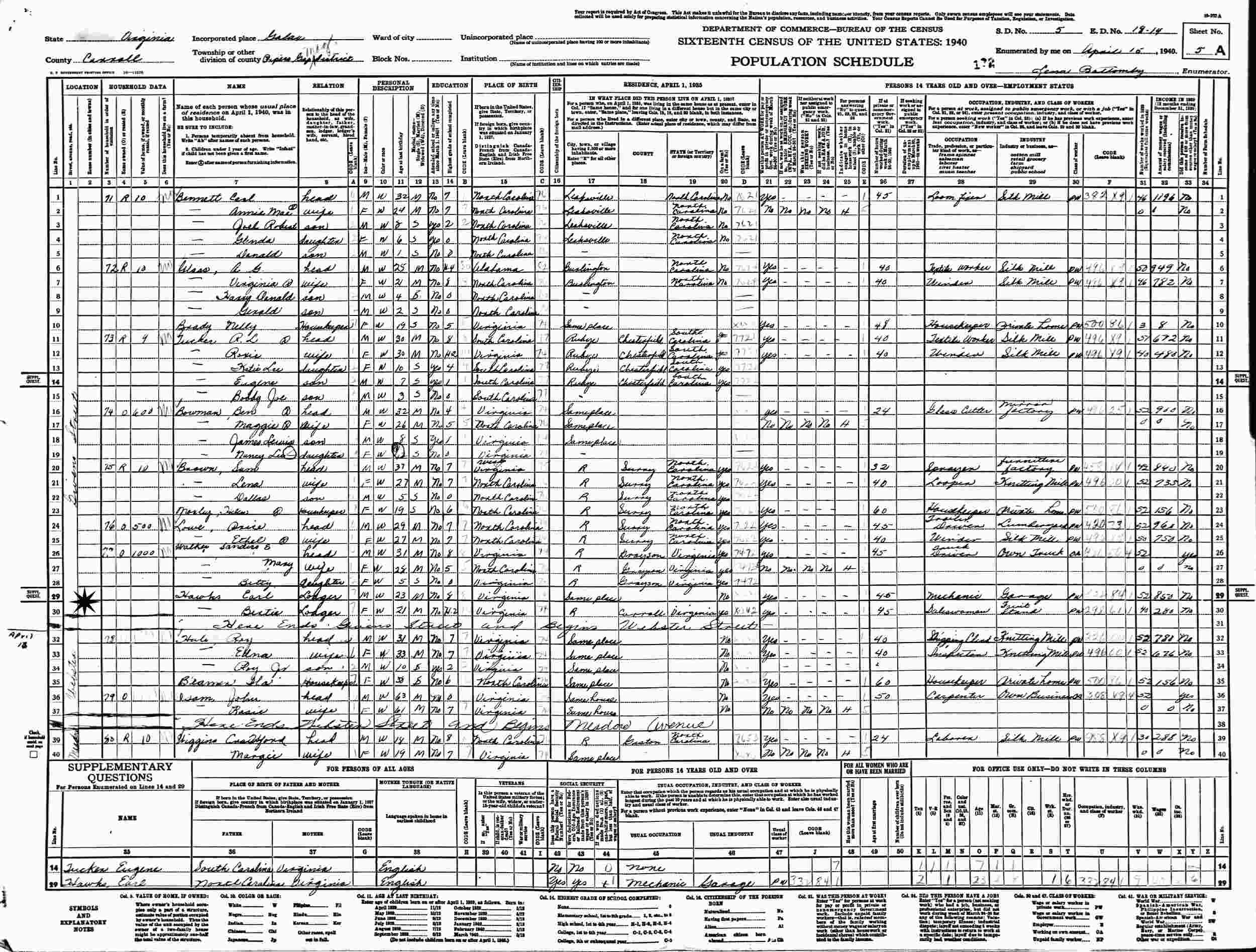 April 15, 1940 - Pipers Gap District, Supervisor's District 8, Enumeration District 18-13, Carroll County, Virginia.