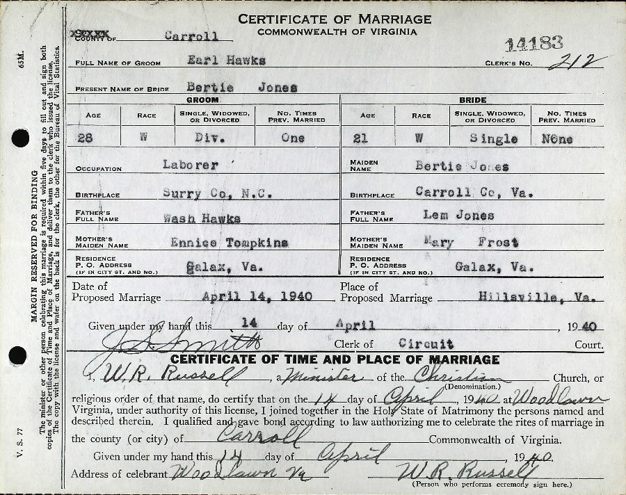 Married: Earl (Early) David Harden Hawks April 14, 1940 in Woodlawn, Carroll County, Virginia.