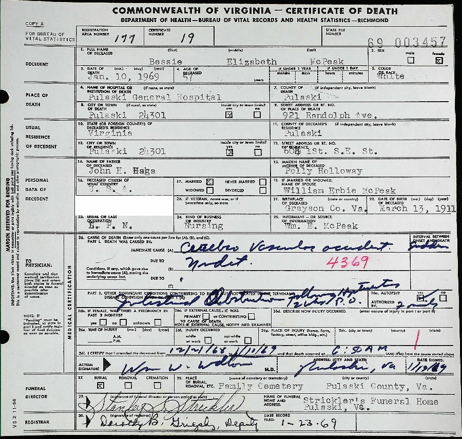 Died: January 10, 1969 in Pulaski, Pulaski County, Virginia.