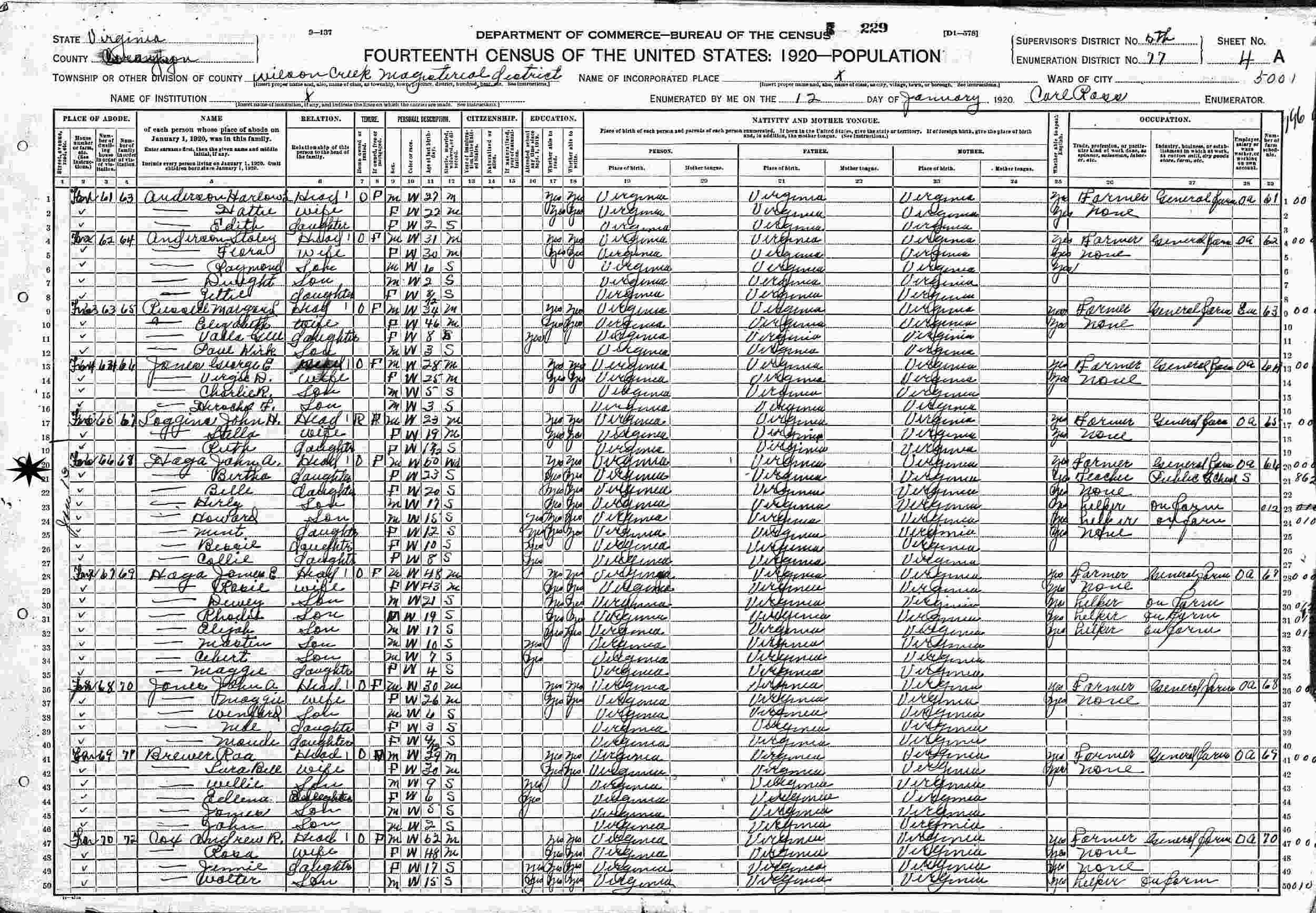 January 13, 1920 - Wilson Creek Magisterial District, Supervisor's district 5, Enumeration District 77, Grayson County, Virginia.