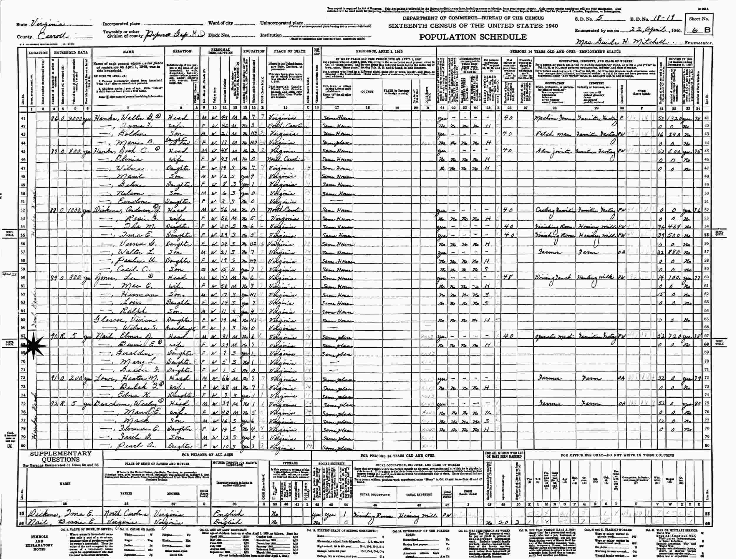 April 22, 1940 - Hanks Road, Supervisor's District 5, Enumeration District 18-19, Pipers Gap Magisterial District, Carroll County, Virginia.